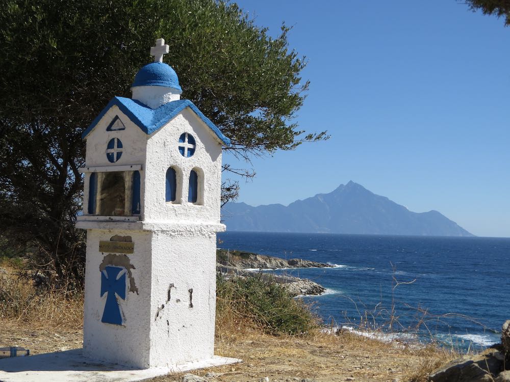 Dann ging es weiter an der Ostküste entlang Richtung Süden. Die Landschaft wurde nun merklich bergiger, und der Berg Athos, der ganz im Süden der gleichnamigen Nachbarhalbinsel liegt, kam auch immer näher, hier im Hintergund hinter einer weiteren der vielen Minikirchen.