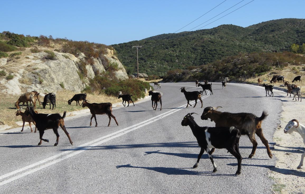Kalamitsi war von den leicht erreichbaren Stränden der südlichste an der Ostseite. So habe ich dann die Fahrt zum Umrunden der Südspitze fortgesetzt und bin unterwegs noch einer Ziegenherde begegnet.