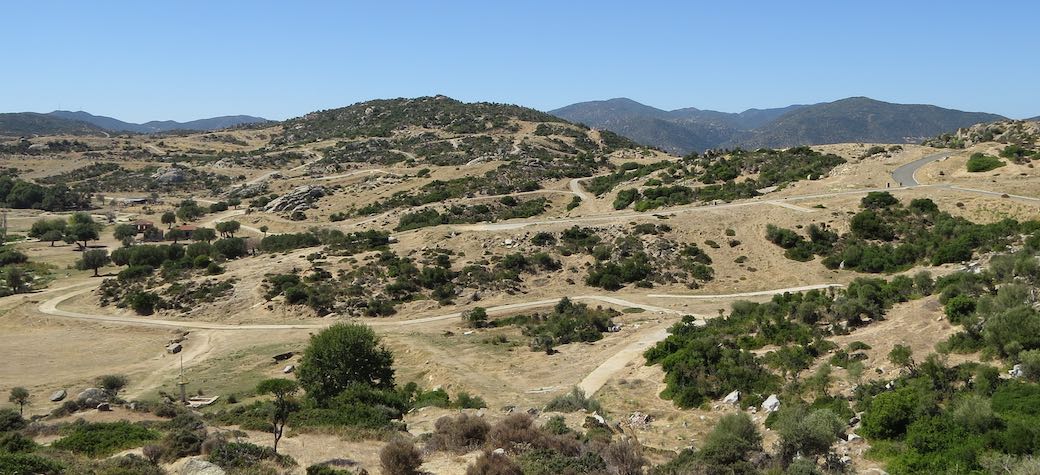 Auf der Landzunge südlich der Bucht Paralia Sykias gab es nämlich ein großes Bauprojekt, zu dem die Straßen schon gebaut wurden. Der Bau ist dann aber nicht mehr genehmigt worden und so sind nur die vielen Straßen und Wege geblieben, von denen das vorige Foto einen Teil zeigt, die aber nirgendwo hinführen und in unterschiedlichen Zuständen sind. Sie sind teilweise asphaltiert, oder als eher schmale Betonwege ausgebildet. Zusätzlich gibt es Sandpisten. Das Straßen-Labyrinth ist ziemlich groß, etwa zwei mal drei Kilometer.