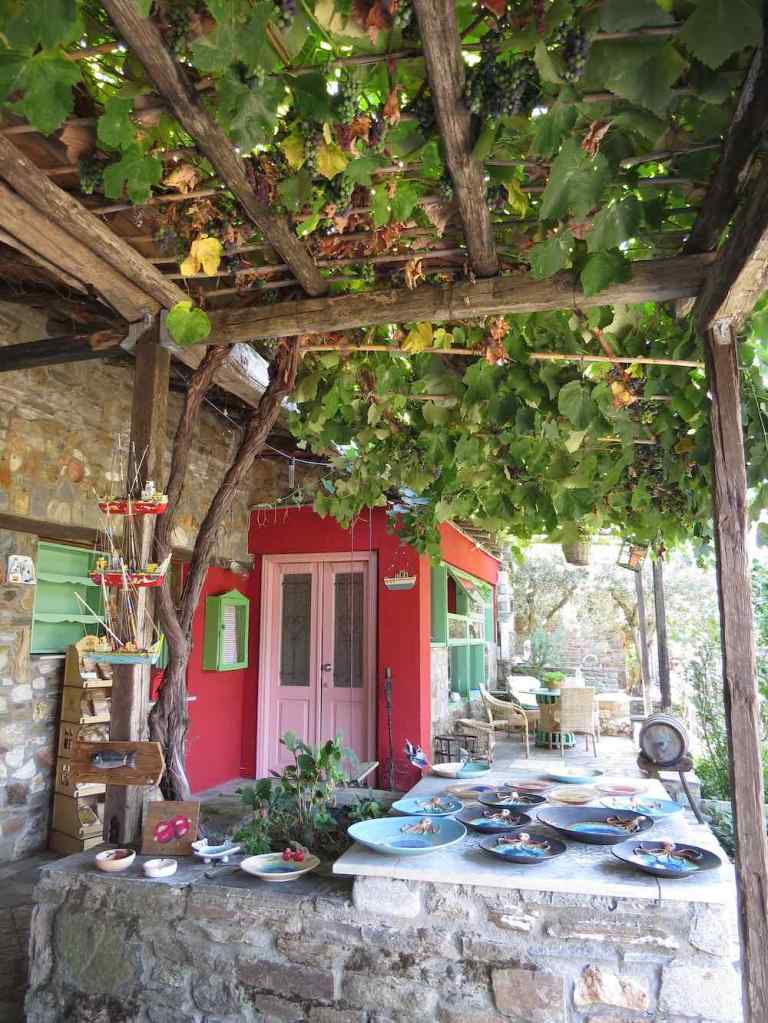 Von dort verläuft eine nette kleine Straße das Dorf hinauf (s. oben). Man könnte fast sagen, dass es die einzige Straße ist. Sie hat auch einen Souvenirladen mit hübscher mit Wein überwachsener Terrasse .