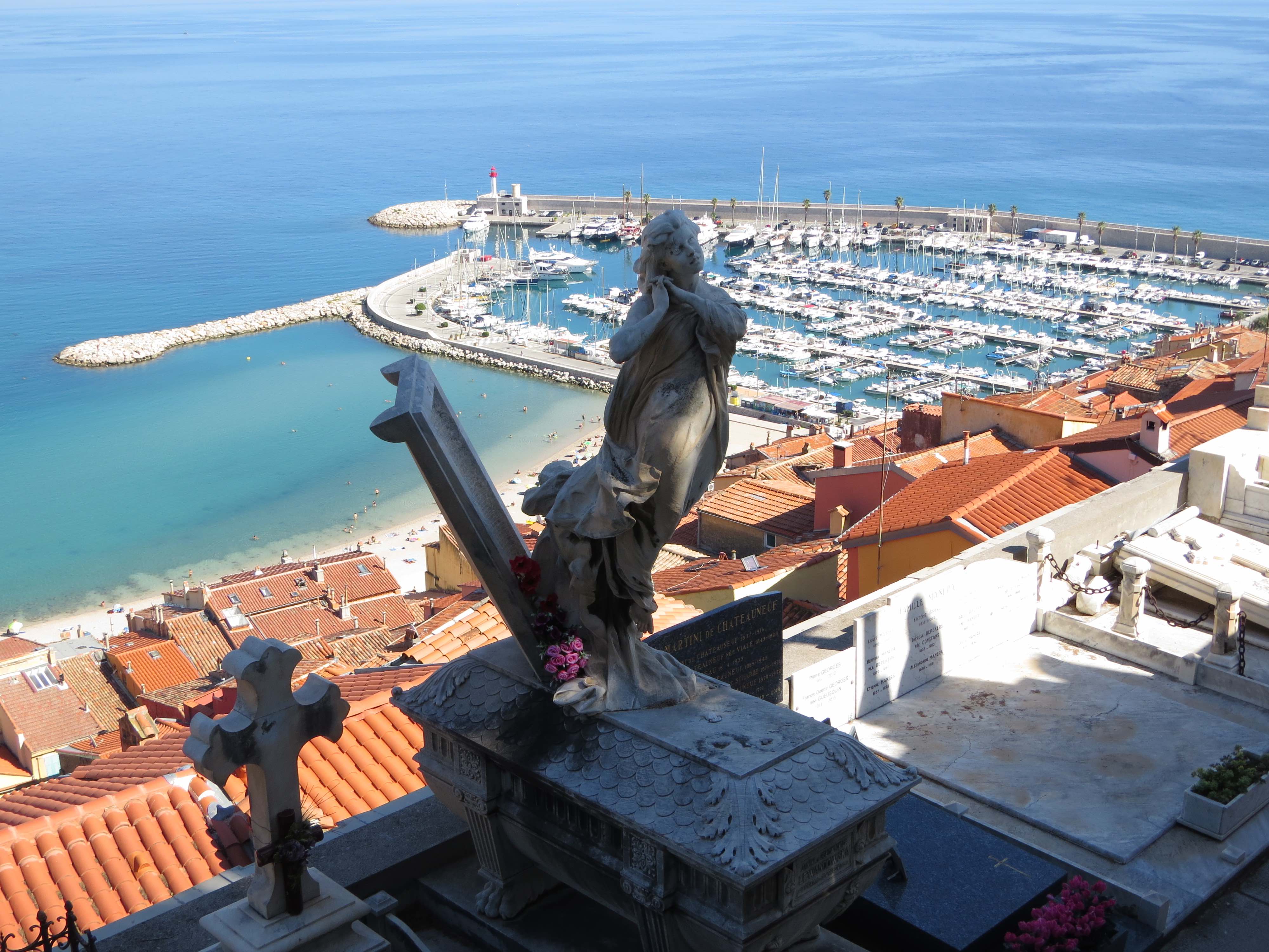 Neben dem Ausblick sind aber auch die Gräber interessant, deren Inschriften neben Franzosen und Italienern auch viele Deutsche und auch Polen zeigen. Auf dem Bild oben ist die Statue auf dem Grab von Janina Lewandowska, die nur 26 Jahre als geworden ist. Der Friedhof ist beeindruckend, aber leider nicht gut gepflegt und viele Gräber verfallen.