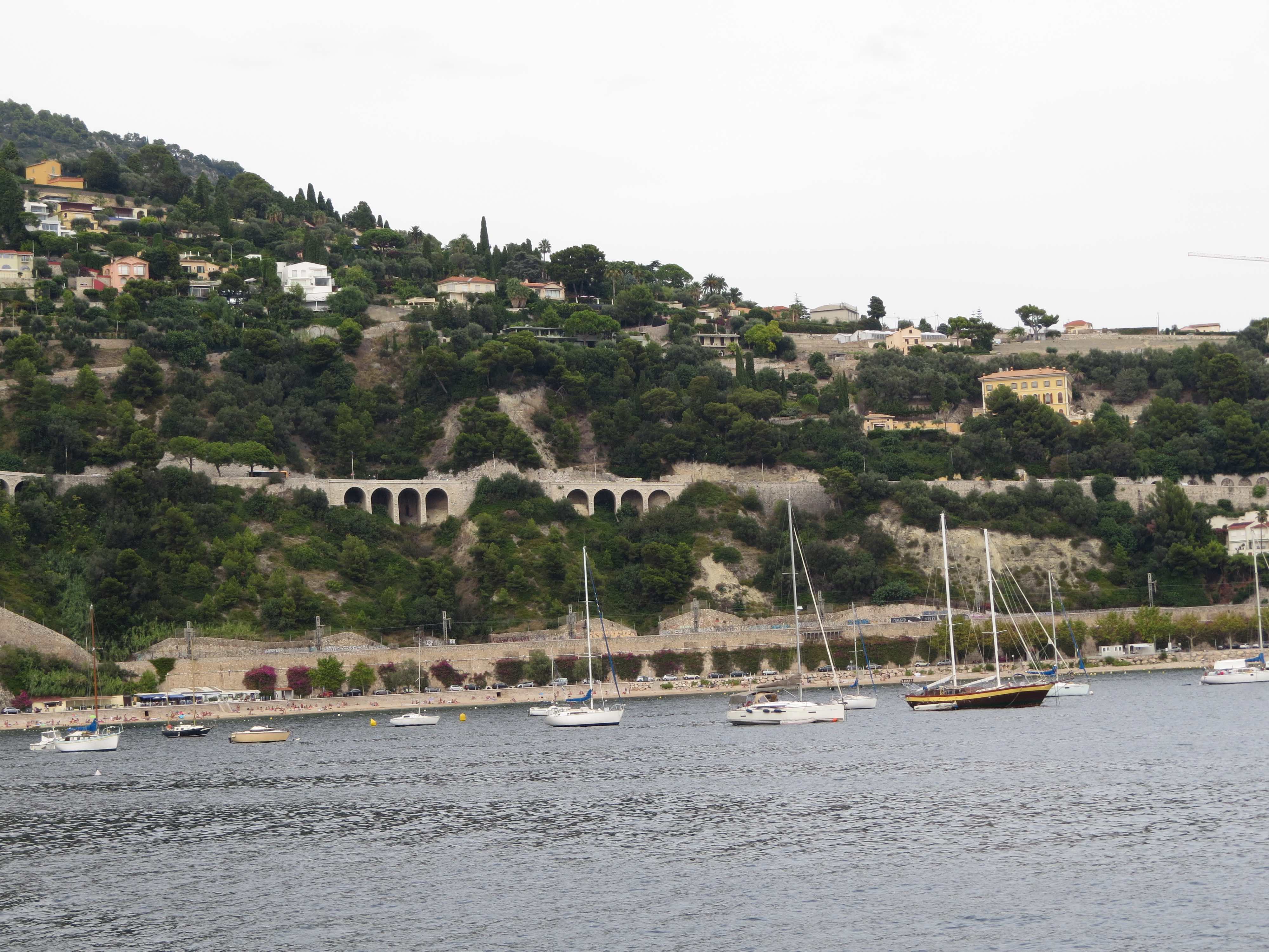 Wir haben den Tag dann am langgezogenen Strand ausklingen lassen und sind auf dem Rückweg noch kurz in Villefranche vorbeigefahren, mit Blick auf einen Strand, den wir am nächsten Tag besucht haben, mit Eisenbahnstrecke und Viadukt im Hintergrund.
