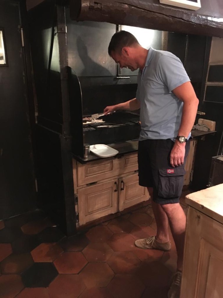 Den Tag haben wir dann am Stadtstrand ausklingen lassen, direkt hinter der Stadtmauer. Gegessen haben wir dann in Cagnes sur Mer, nämlich in einem Restaurant direkt neben unserer Unterkunft. Das wurde von einer Familie geführt, jedenfalls hat Papa gekocht und die Tochter bedient. Ein Teil der Küche war direkt im Gästeraum und meinen Tintenfisch durfte ich dort einmal selbst auf dem Grill wenden.