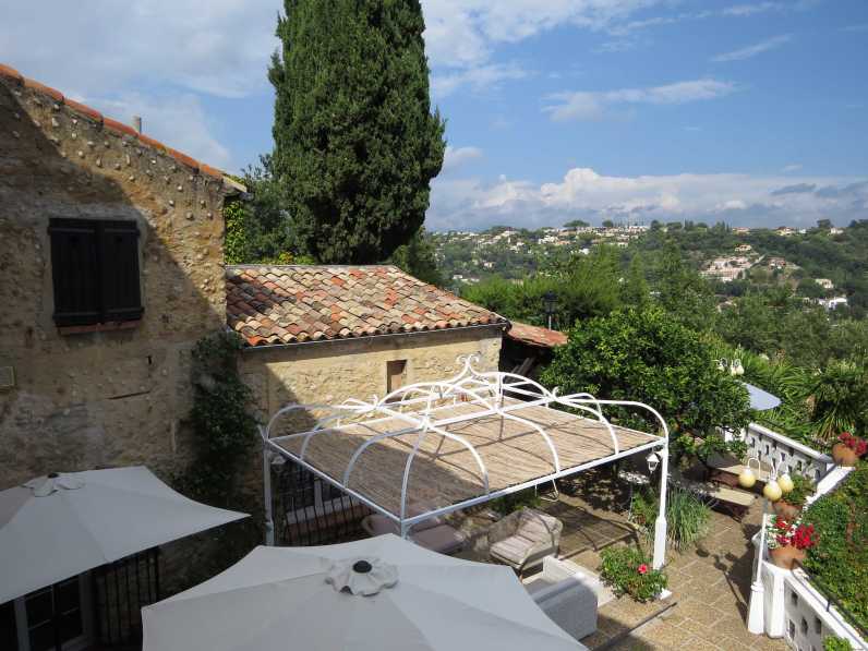 Dann ging es weiter nach Cagnes sur Mer. Unsere liebevolle, privat betriebene Unterkunft lag hoch oben in der historischen Altstadt von Cagnes zur Mer. Und wir hatten einen schönen Blick aus unserem Fenster auf die Frühstücksterrasse und die Landschaft.