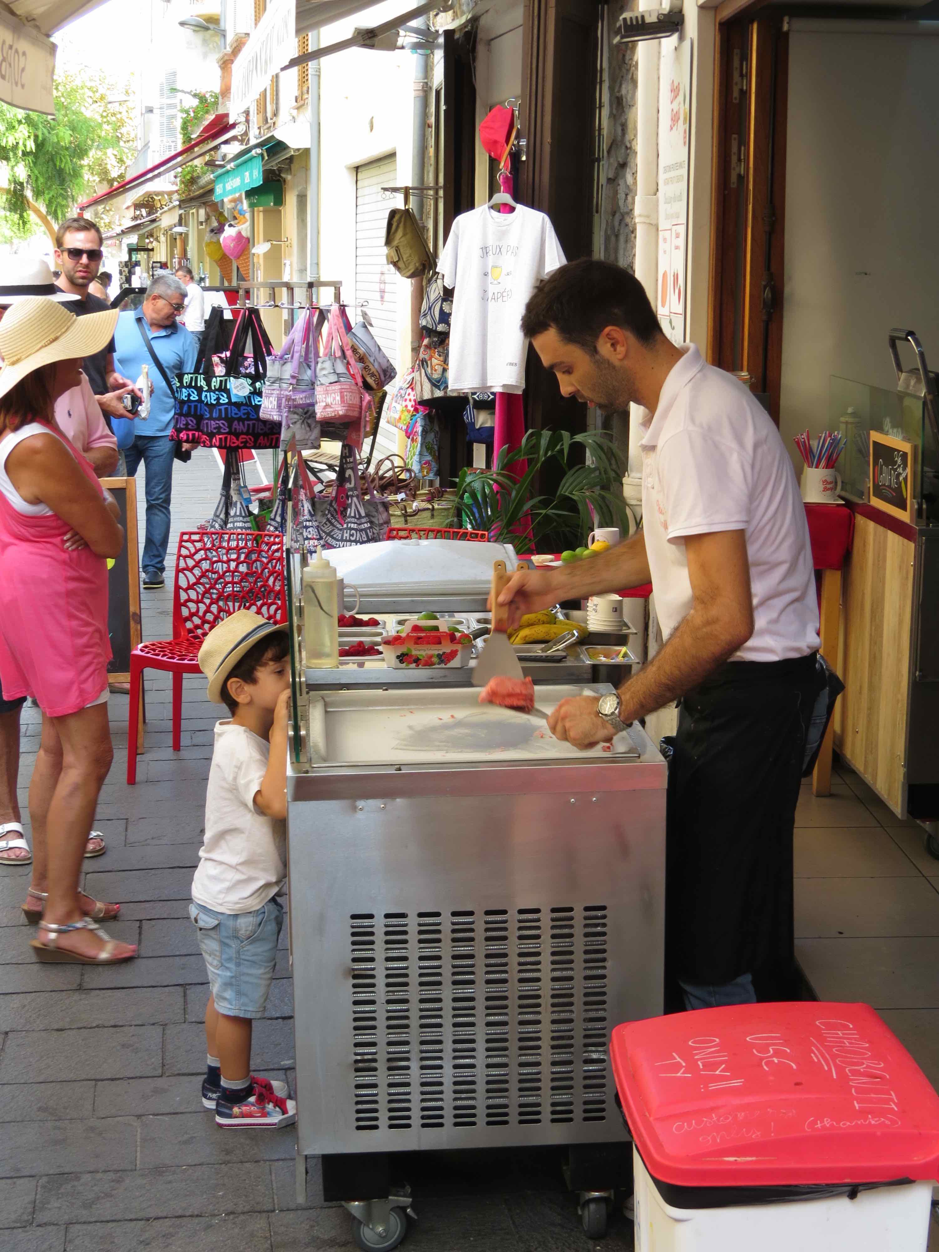 Lust auf Eis? Aber wie macht man leckeres Fruchteis? Man nehme die gewünschten Früchte, zerkleinere und zermansche sie auf einer eiskalten Platte, gebe etwas Wasser dazu und spachtle die entstehende Masse mit viel Dynamik hin und her. Das hat auch den kleinen Jungen faszieniert. Das Ergebnis war wirklich ausgezeichnet lecker und hat tatsächlich nach Frucht geschmeckt.