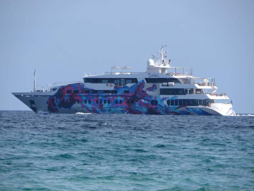 Ansonsten lag noch eine Mega-Yacht in der Nähe des Strandes vor Anker, die dann abfuhr. Sie hatte eine interessante Farbgestaltung, die gut zu Himmel und Meer passte.