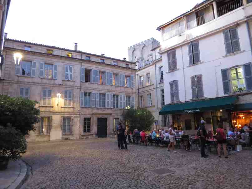 Avignon strahlt ein ganz eigenes, angenehmes Flair aus. Häufig sind blinde Fenster mit einem Gemälde versehen, das Leute zeigt, die aus dem Fenster sehen. Trotz vieler sehr enger Straßen gibt es einige Plätze. Auf einem haben wir zu Abend gegessen: