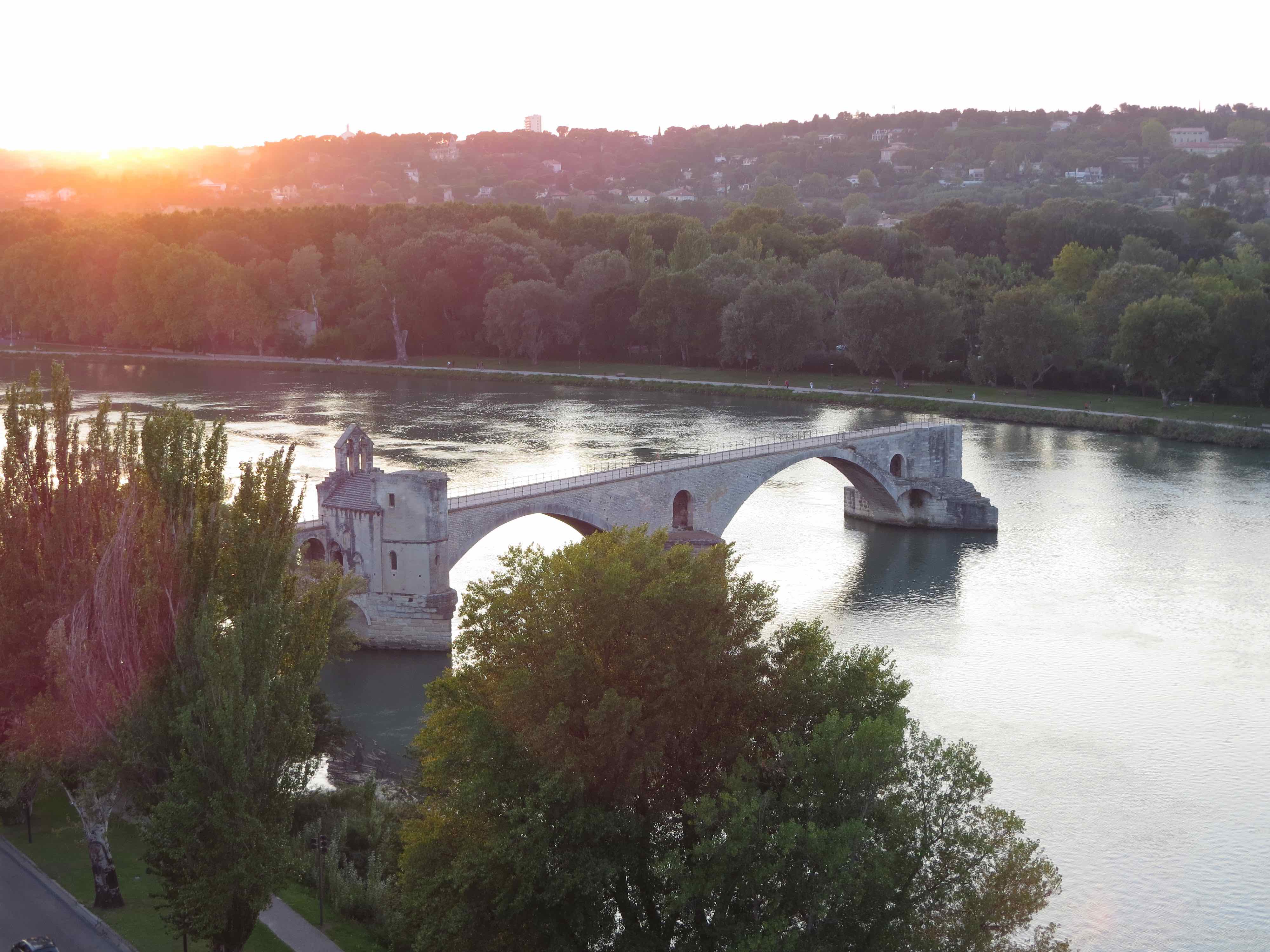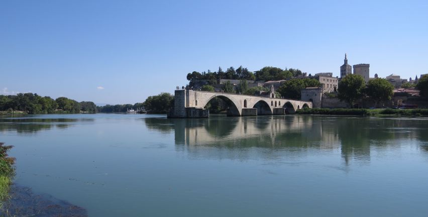 Wir sind natürlich besonders wegen der Pont Saint-Bénézet nach Avignon gekommen, die hier vom Garten am Papstpalast aus zu sehen ist, mit der Île de la Barthelasse im Hintergrund.