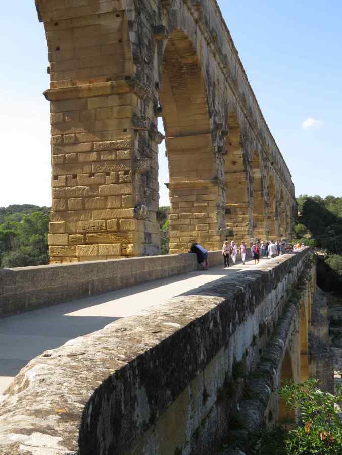 Die Pont du Gard, also die Brücke über den Gard (oder den Gardon) ist im ersten Jahrhundert a.D. als Aquädukt gebaut worden, nämlich für die Wasserversorgung der Stadt Nimes. Erst im 18. Jahrhundert wurde die untere Ebene verbreitert, um als Straße dienen zu können. Das kann man auch heute noch an der unterschiedlichen Oberfläche der Steine erkennen. Die zweite und dritte Ebene des Bauwerks steht daher nur auf der einen Seite der unteren Ebene, nämlich der alten Seite.