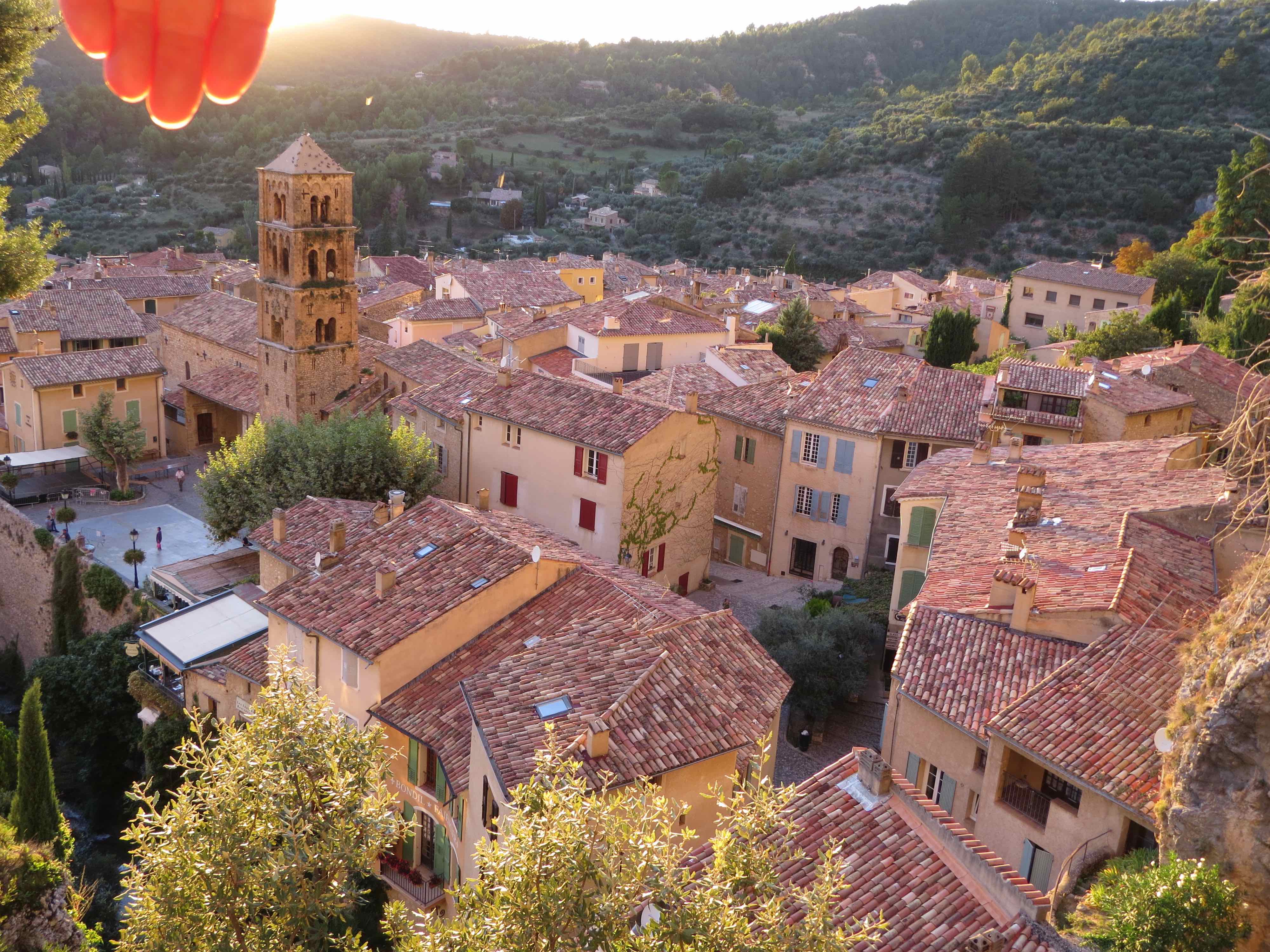 Wir wollten aber auch noch zur Kapelle hochgehen, die oberhalb des Ortes liegt. Auf dem Weg nach oben gibt es tolle Ausblicke auf die Dächer von Moustiers. Die tief stehende Sonne hat die Dächer in ein schönes Licht getaucht, das aber auch vom Objektiv fern gehalten werden musste.