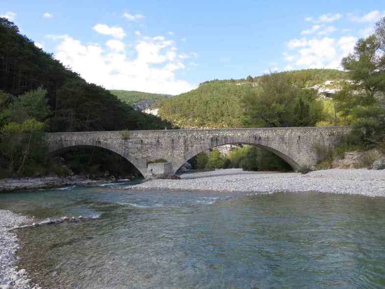 Am Eingang zur Schlucht, bezogen auf unsere Reiserichtung am Ende, haben wir dann noch bei einer weiteren Steinbücke gehalten, der Pont de Carajuan. Sie soll lt. waymarking.com aus dem Jahre 1655 stammen, allerdings nach einem Flutereignis im Jahre 1886 erst repariert und dann neu aufgebaut worden sein.