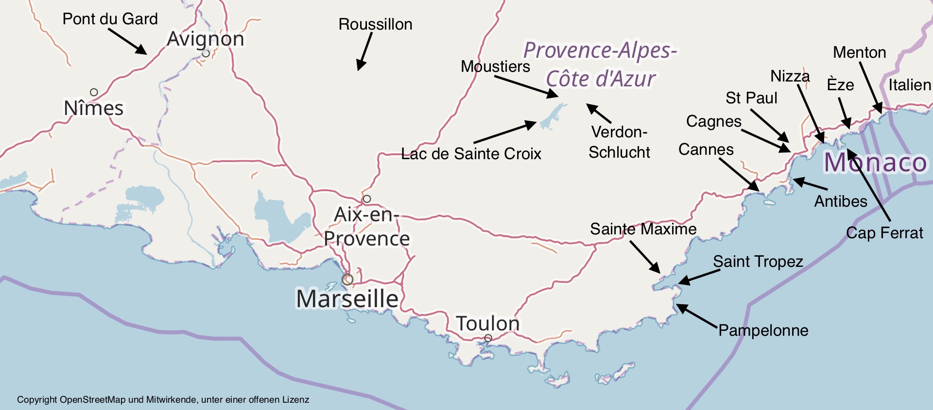 Die Cote d’Azur ist im Osten sehr felsig und steil und alles macht eher einen eingeengten Eindruck. Nach Westen hin werden die Felsen dann weniger und die zunehmend flachere Landschaft ist auch weniger dicht besiedelt.