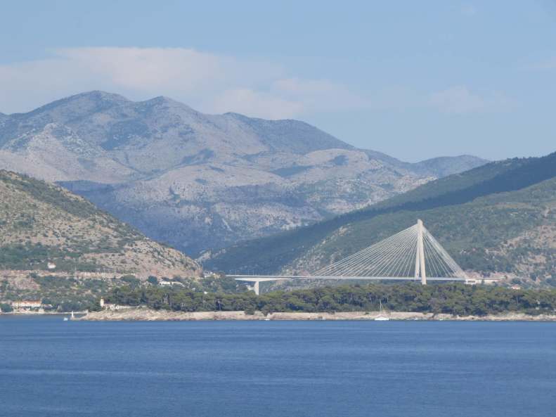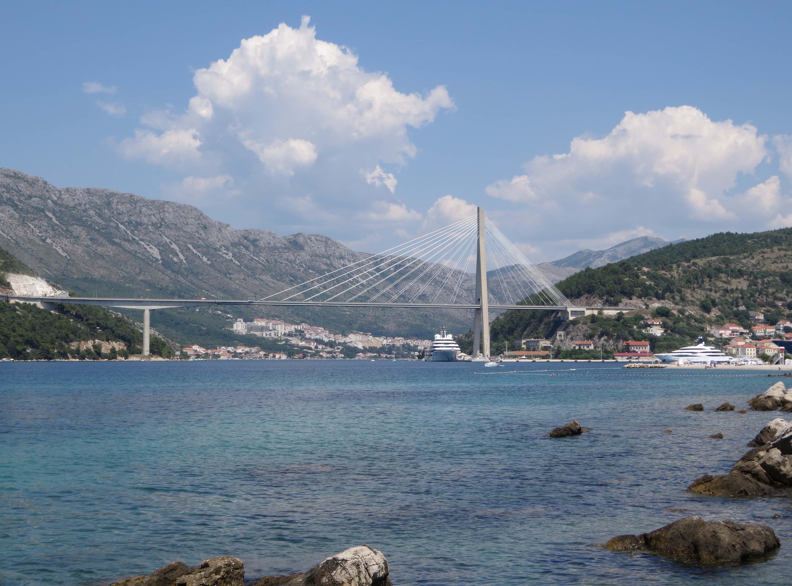 Es war ein Kiesstrand, was eigentlich ganz angenehm ist. Typisch für Kroatien ist auch, dass Betonterrassen bis an das Wasser gebaut und teilweise mit Badeleiter versehen sind. Von hier aus gab es auch einen guten Blick auf die beeindruckende Schrägseilbrücke, die die tief einschneidende Bucht des Ombla überspannt.