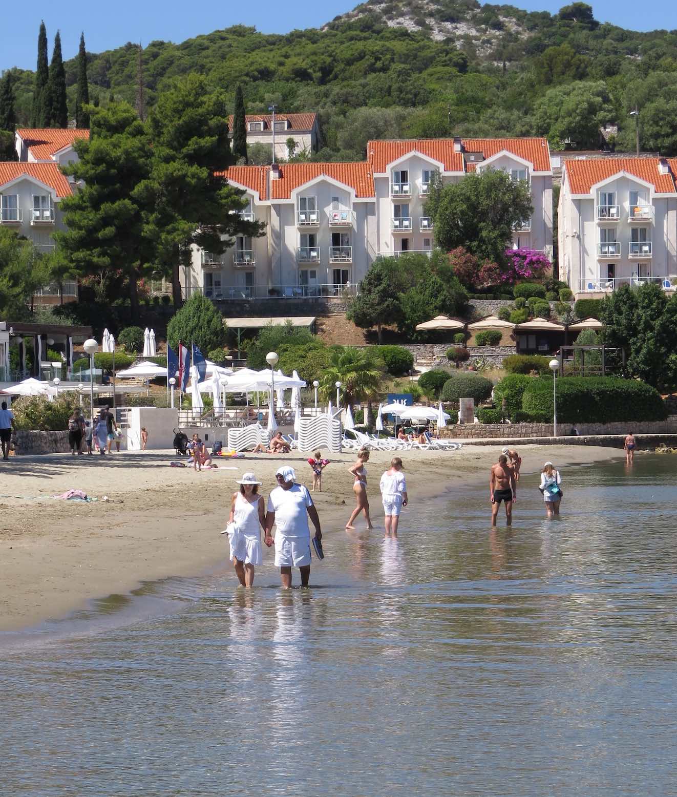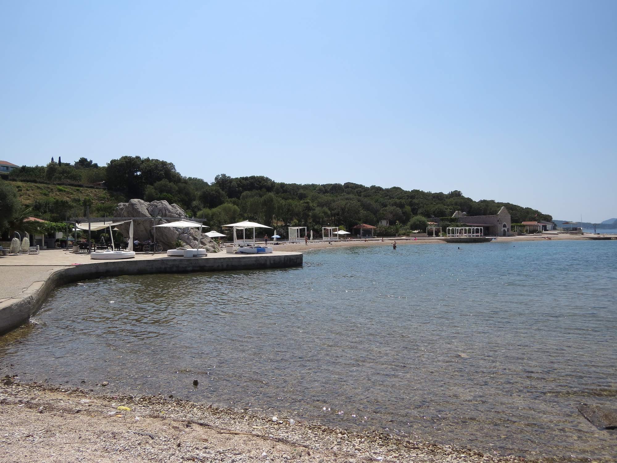 Am ersten vollständigen Tag wollten wir zunächst einen Strand aufsuchen. Der Stadtteil unseres Hotels, Lapad, liegt am Fuße einer Halbinsel, die auch ein paar Strände haben soll. Wir sind ein Stück mit dem Auto gefahren und haben einen Parkplatz und schließlich den Strand gesucht. Die Suche ging zwischen Baustellen und einem Riesenhotel hindurch und erinnerte etwas an einen Sketch von Loriot mit dem Titel Pauschalurlaub. Es gab dort aber auch schöne Ausblicke auf die Inselwelt, hier auf die unbewohnte Insel Daksa.