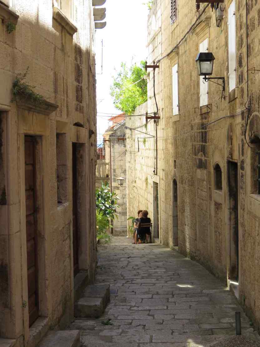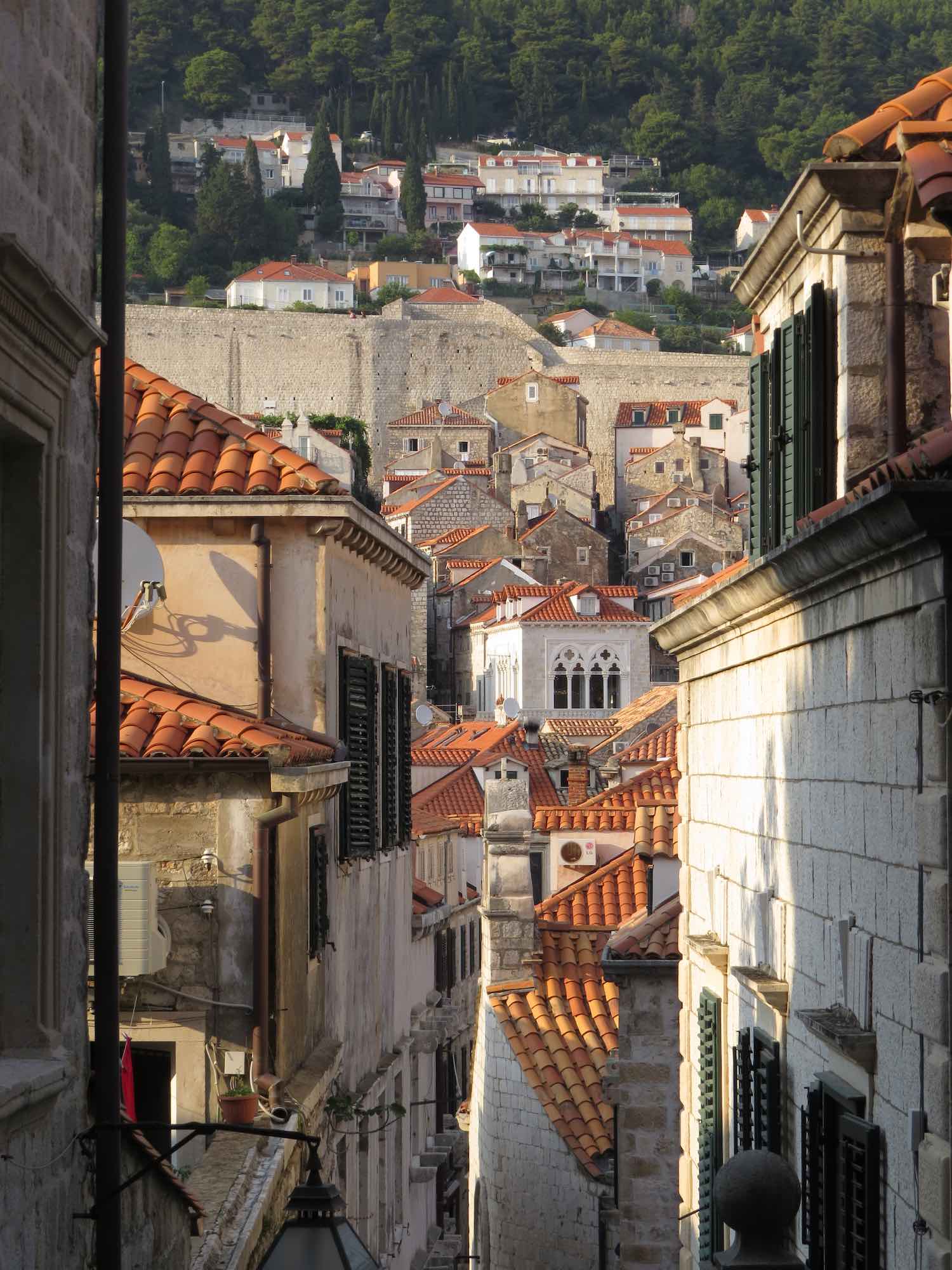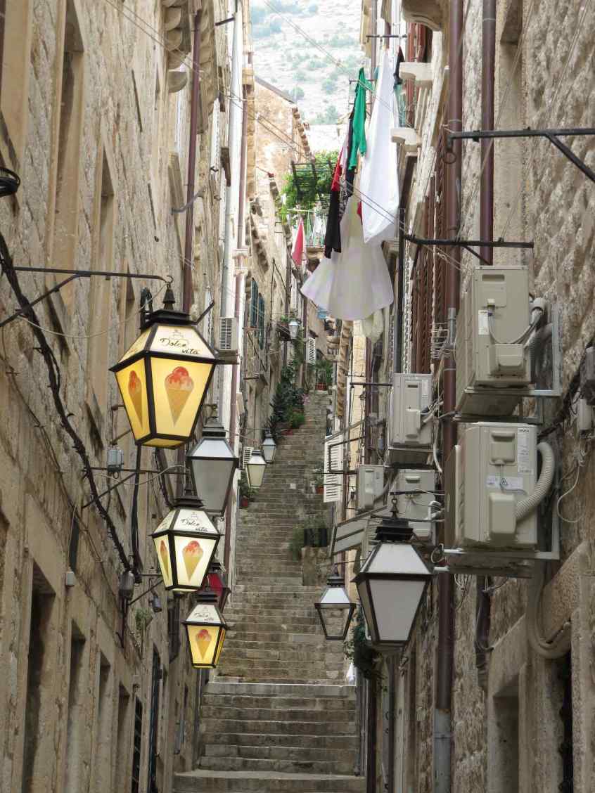 Einige Straßen sind fast waagerecht, aber tatsächlich ist die Altstadt von Dubrovnik eher wie ein Tal ausgebildet. Die Placa-Stradun und ein paar weitere Gassen liegen unten und von dort steigen die Straßen zu beiden Seiten steil an, meist mit Treppen.