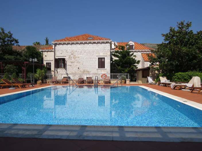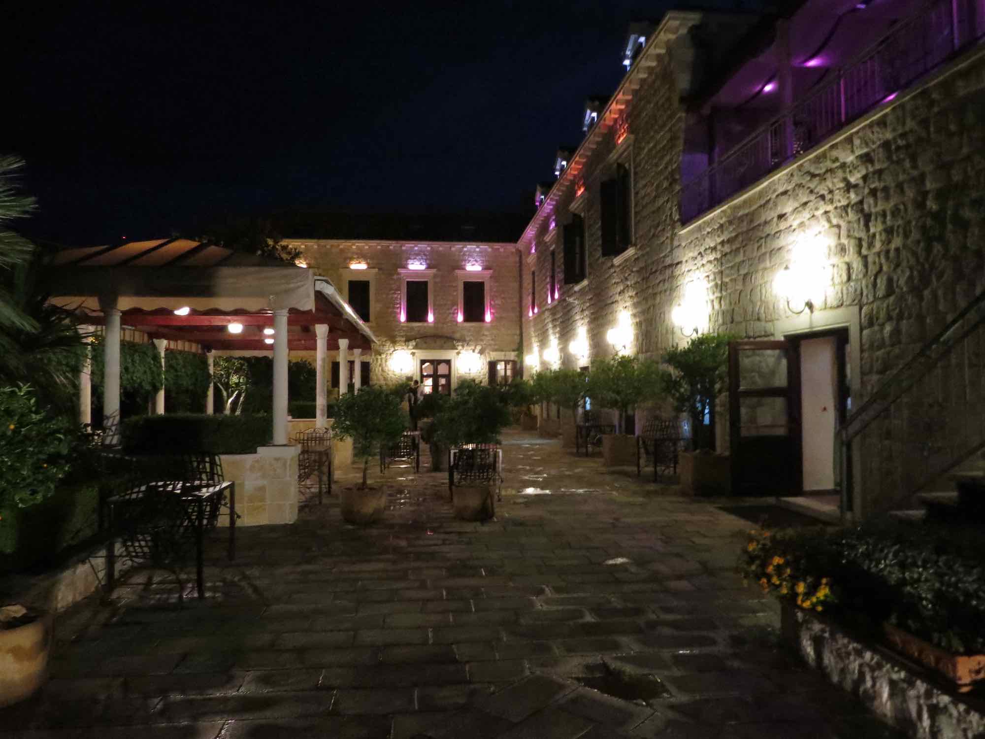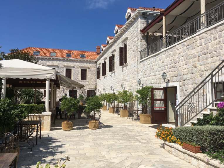 Unser Hotel lag dann in dem Stadtteil Lapad, vis-à-vis einer Bucht, in der sonst auch die Kreuzfahrtschiffe regelmäß anlegen. Das Hotel wahr sehr hübsch und stilecht wieder aufgebaut. Hier ist der Innenhof zu sehen, in dem auch gegessen wird, einschließlich Frühstück. Der zweite Fensterladen von rechts war unser Zimmer.