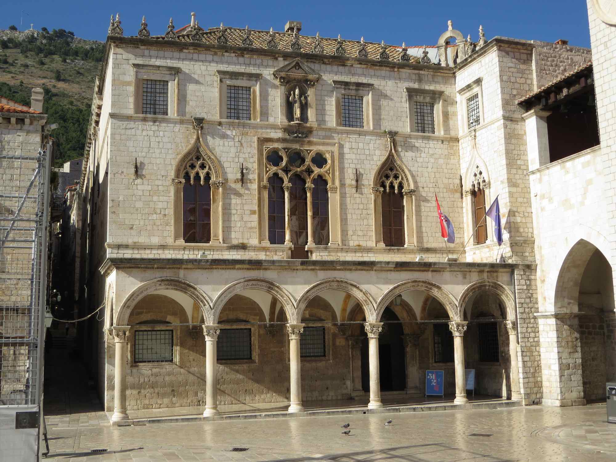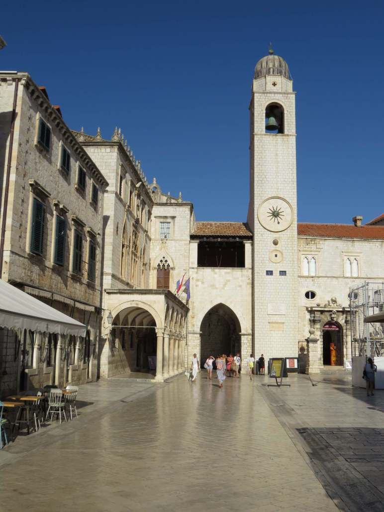 Die zweite breite Straße ist die Pred Dvorom. Sie führt beim Glockenturm, der hier rechts zu sehen ist, auf die Placa-Stradun. Mehr breite Straßen gibt es nicht. Rechts im Bild ist übrigens das Rathaus zu sehen.