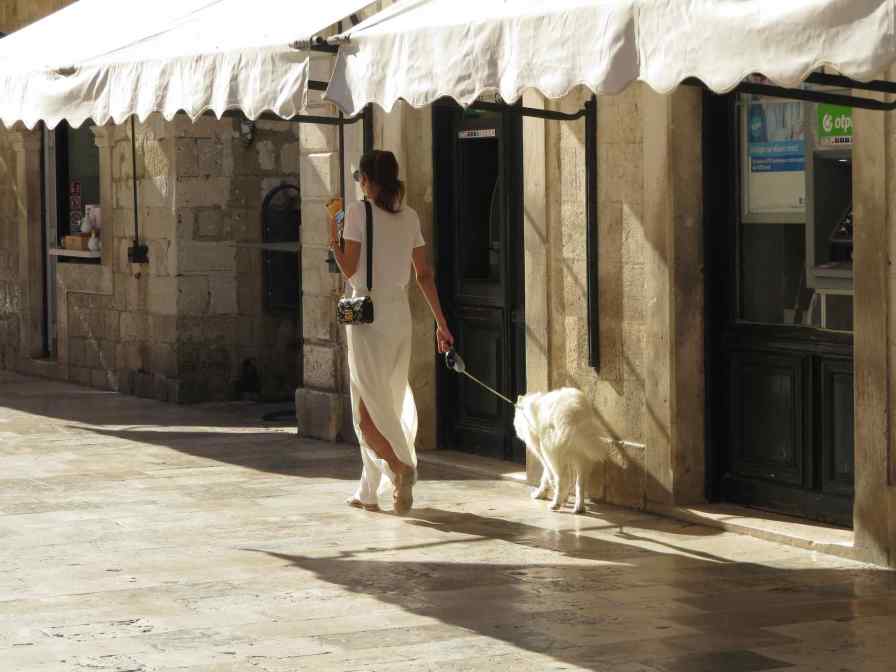 Zum Abschluss konnte ich nicht widerstehen, diese Dame mit Hund zu fotografieren, die so gut zum Stadtbild passte.