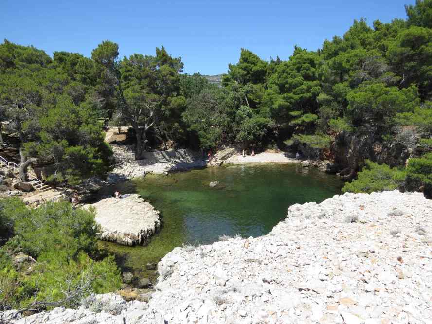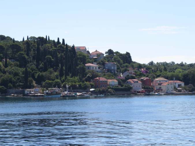 Die Anlegestelle liegt in einer Bucht der Insel. Die Bucht konnten wir bei einem späteren Rundgang noch gut von oben sehen. Der Fähranleger ist auf diesem Foto aber nicht zu sehen, erliegt liegt weiter rechts. Im Hintergrund ist das Festland von Kroatien zu sehen.