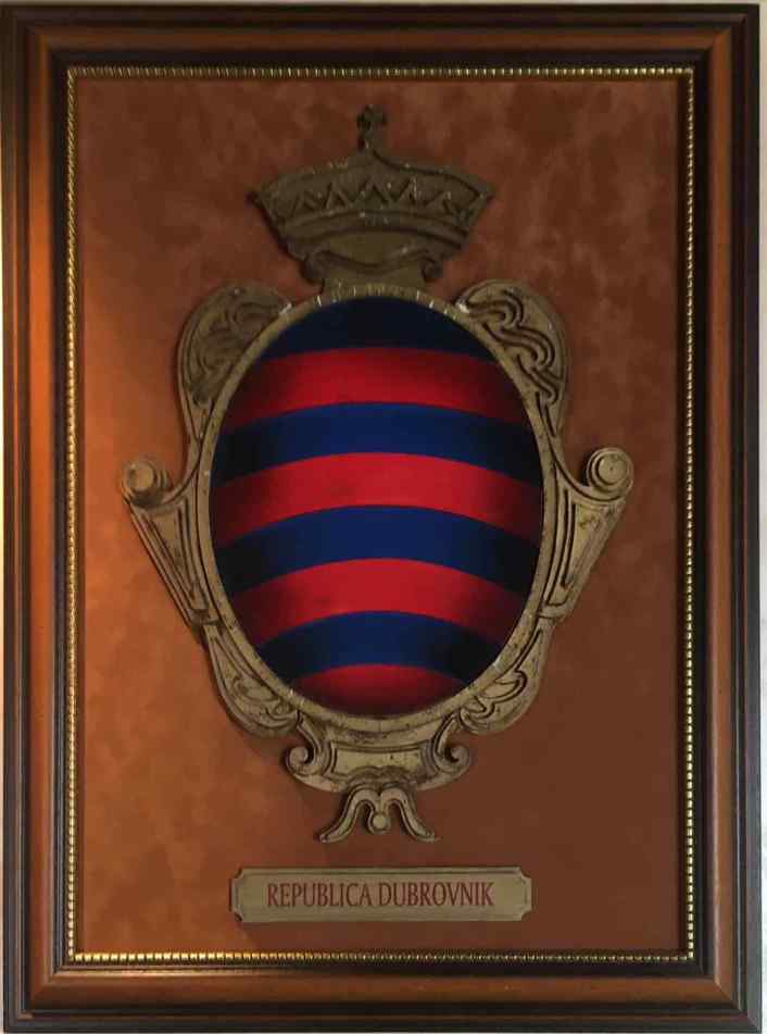 Zunächst eine kurze Flaggenkunde: Die Kroatische Flagge enthält das kroatische Wappen, nämlich das rot-weiße Schachbrettmuster. Auf dem Wappen ist eine Wappenkrone mit fünf vereinfacht dargestellten Wappen aufgesetzt. Das zweite davon ist das von Dubrovnik: