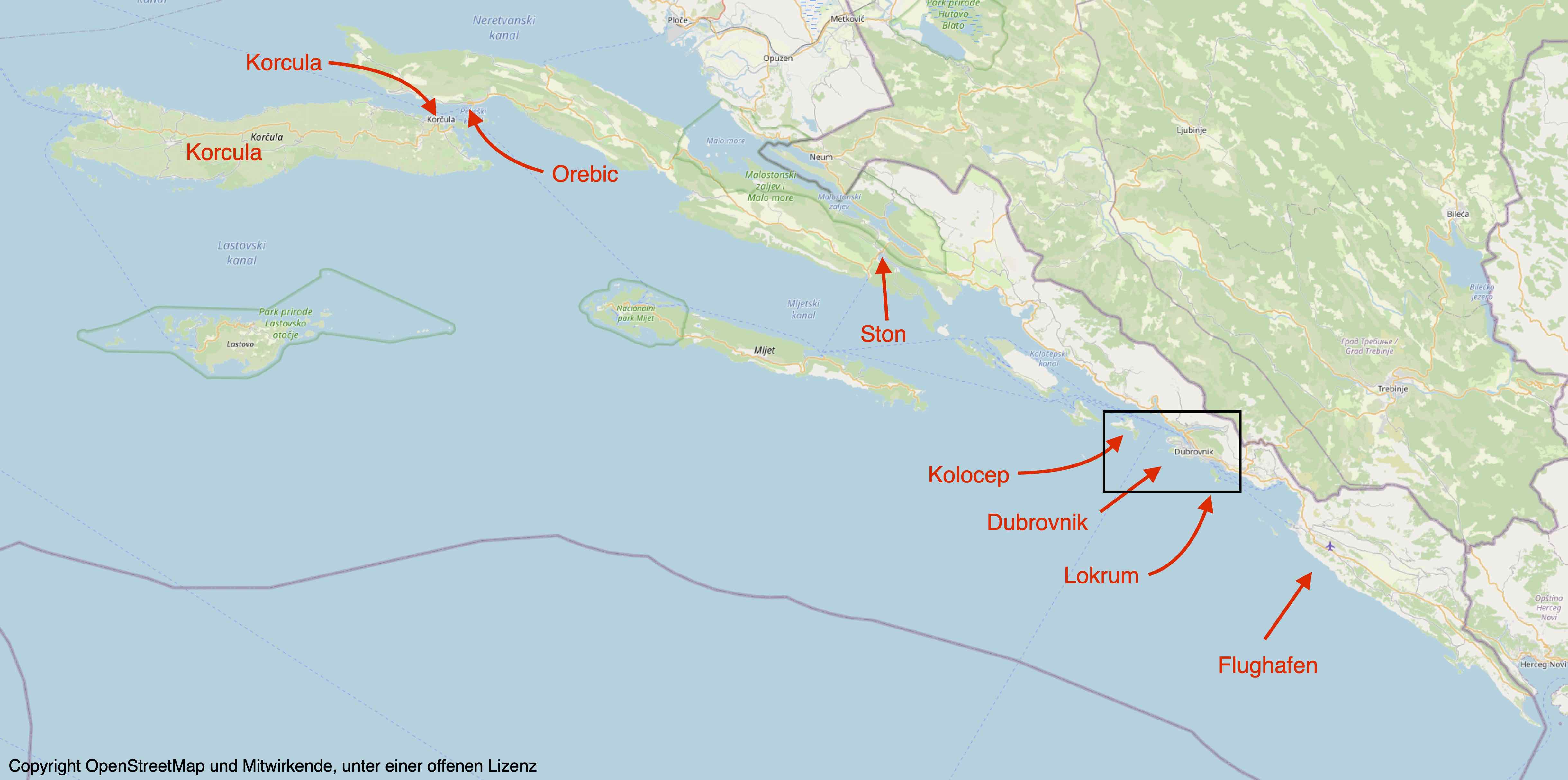 Der folgende Ausschnitt zeigt wie weit wir von Dubrovnik aus Ausflüge gemacht haben. Der weiteste ging bis auf die Insel Korcula.