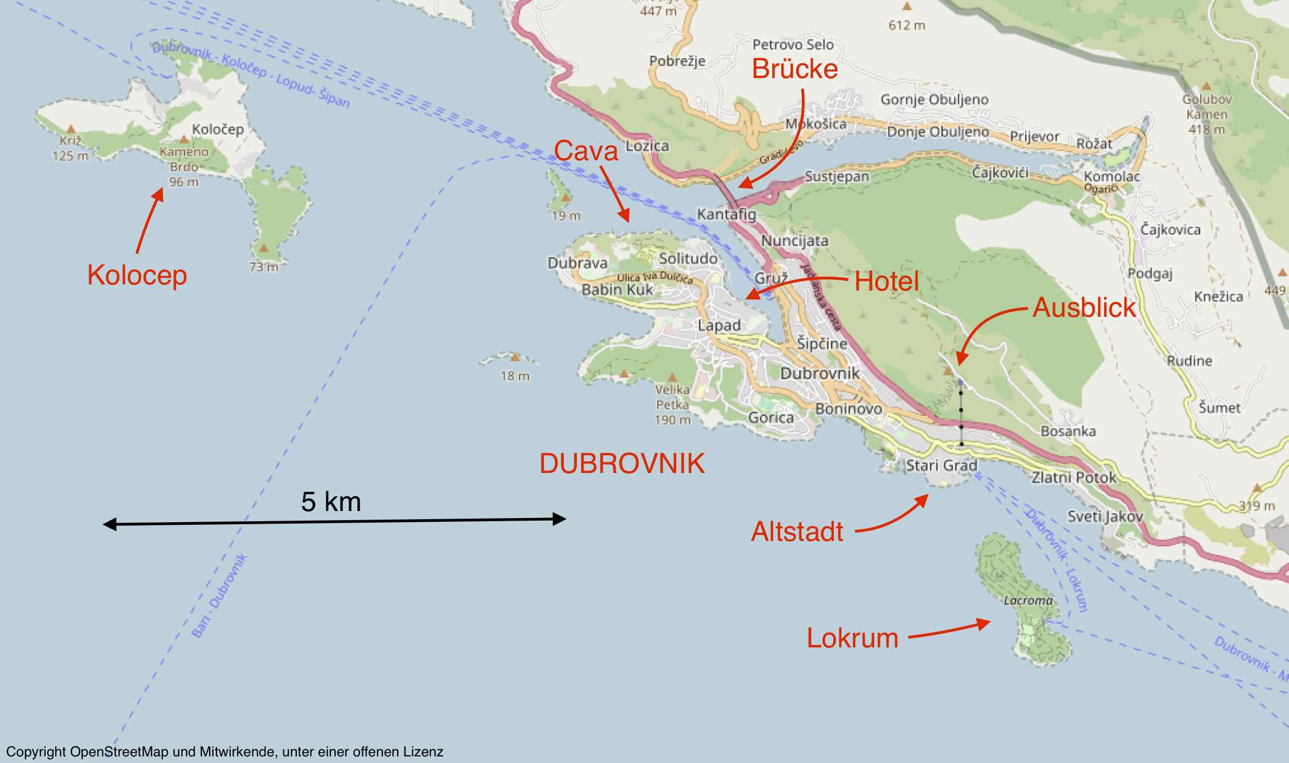 Im nächten Ausschnitt ist der Großraum von Dubrovnik zu sehen. Unser Hotel lag im Stadtteil Lapad und von dort aus konnte man mit dem Bus zur Altstadt fahren. Das waren nur wenige Stationen.