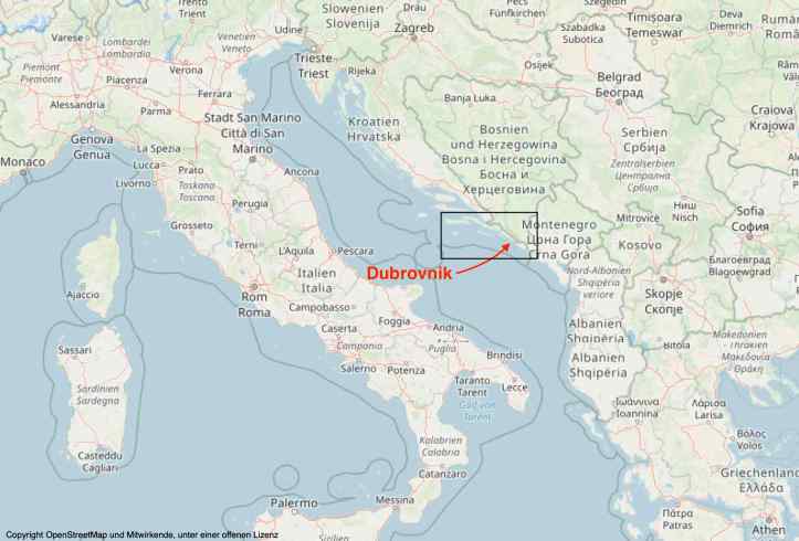 Die Übersichtskarte zeigt die Adria mit der langen kroatischen Küste. Im Süden ist die kroatische Küste durch einen kleinen Küstenstreifen von Bosnien-Herzegovina unterbrochen, nämlich bei Neum. Südlich davon liegt Dubrovnik, auf einem kleinen Küstenstreifen.