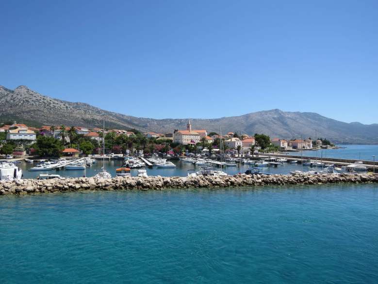 Wir sind somit auch gleich weiter zum Fährhafen Orebic gefahren. Für Orebic selbst hatten wir keine Zeit, aber auf dem Weg zum Hafen haben wir von ihm einen positiven Eindruck bekommen. Das folgende Foto zeigt den Blick zurück von der Fähre auf Orebic. Es ist auch ein Teil der Halbinsel Peljesac zu sehen, die sich wie ein kleiner Gebirgsausläufer in die Adria erstreckt.