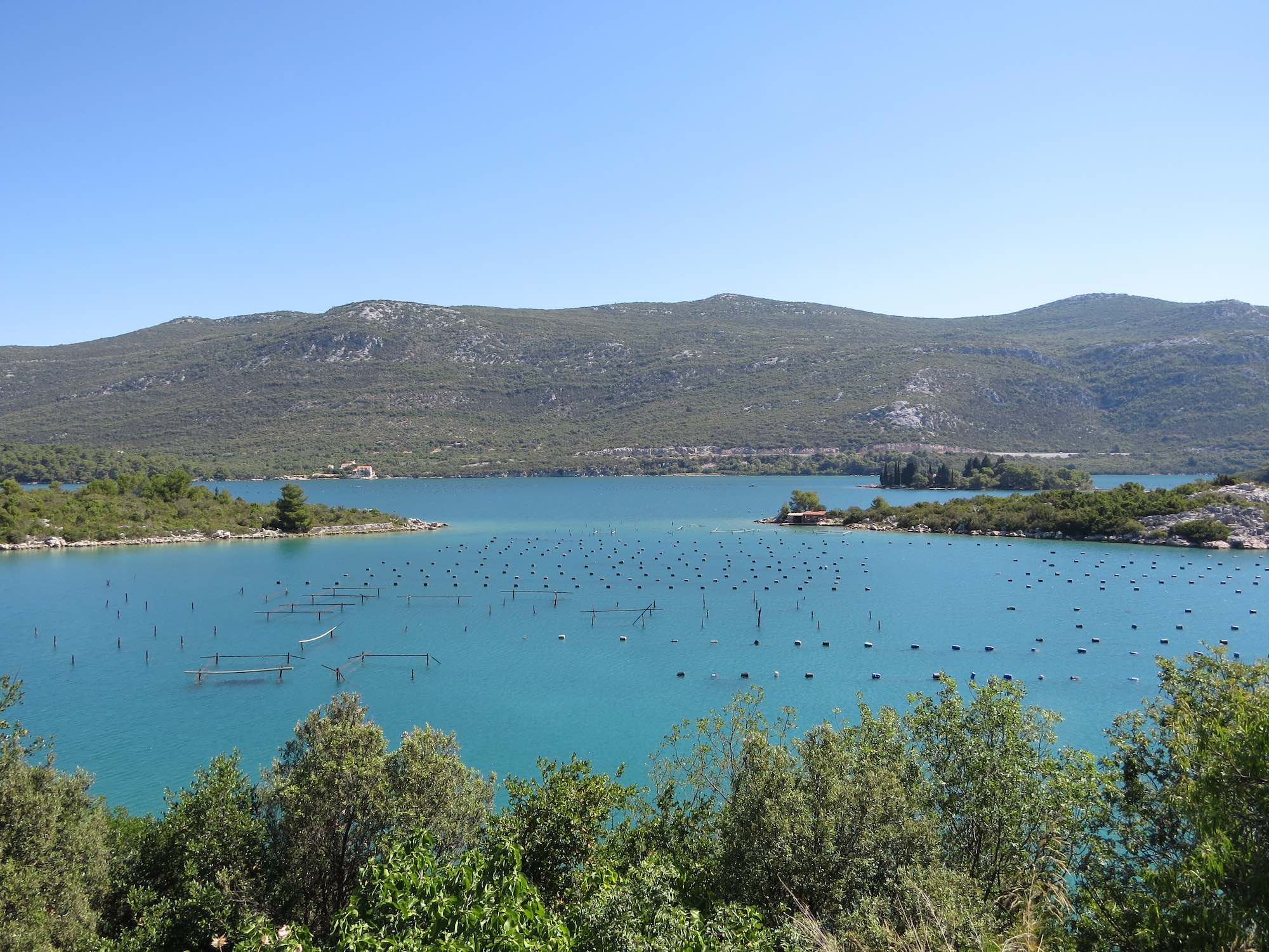 Für heute haben wir einen Ausflug nach Korcula ausgewählt. So heißt eine Insel mit gleichnamigem Ort. Der anzusteuernde Fährhafen Orebic liegt auf der Halbinsel Peljesac, etwa zwei Autostunden von uns entfernt (s. Karte oben). Bei Peljesac gibt es viele Austernfarmen. Die Austern wachsen dabei an einer Konstruktion, wahrscheinlich sind es nur Seile oder Netze, die von vielen Plastikkanistern gehalten wird.