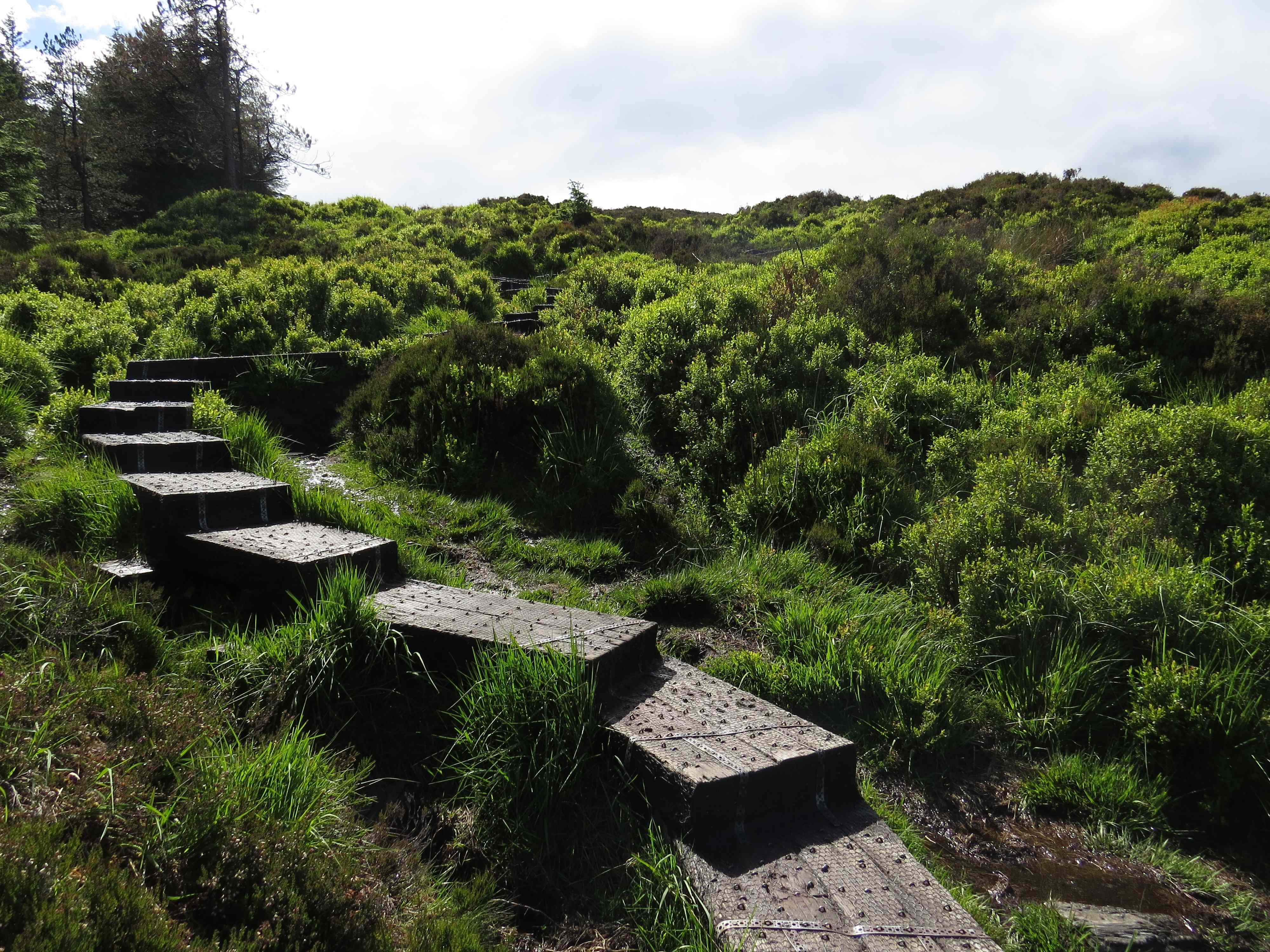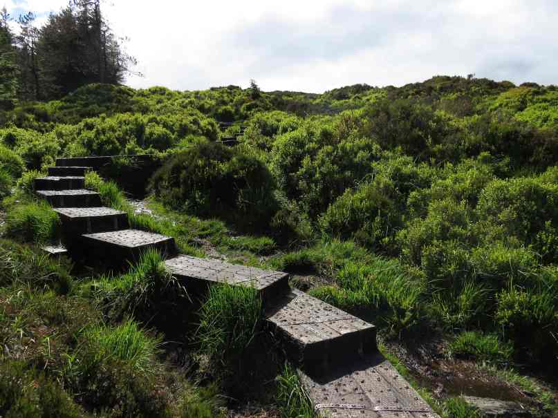 Dann ging es zurück, aber immer noch aufwärts, über alte Bahnschwellen zwischen feuchten, moosbewachsenen Wiesen hindurch.