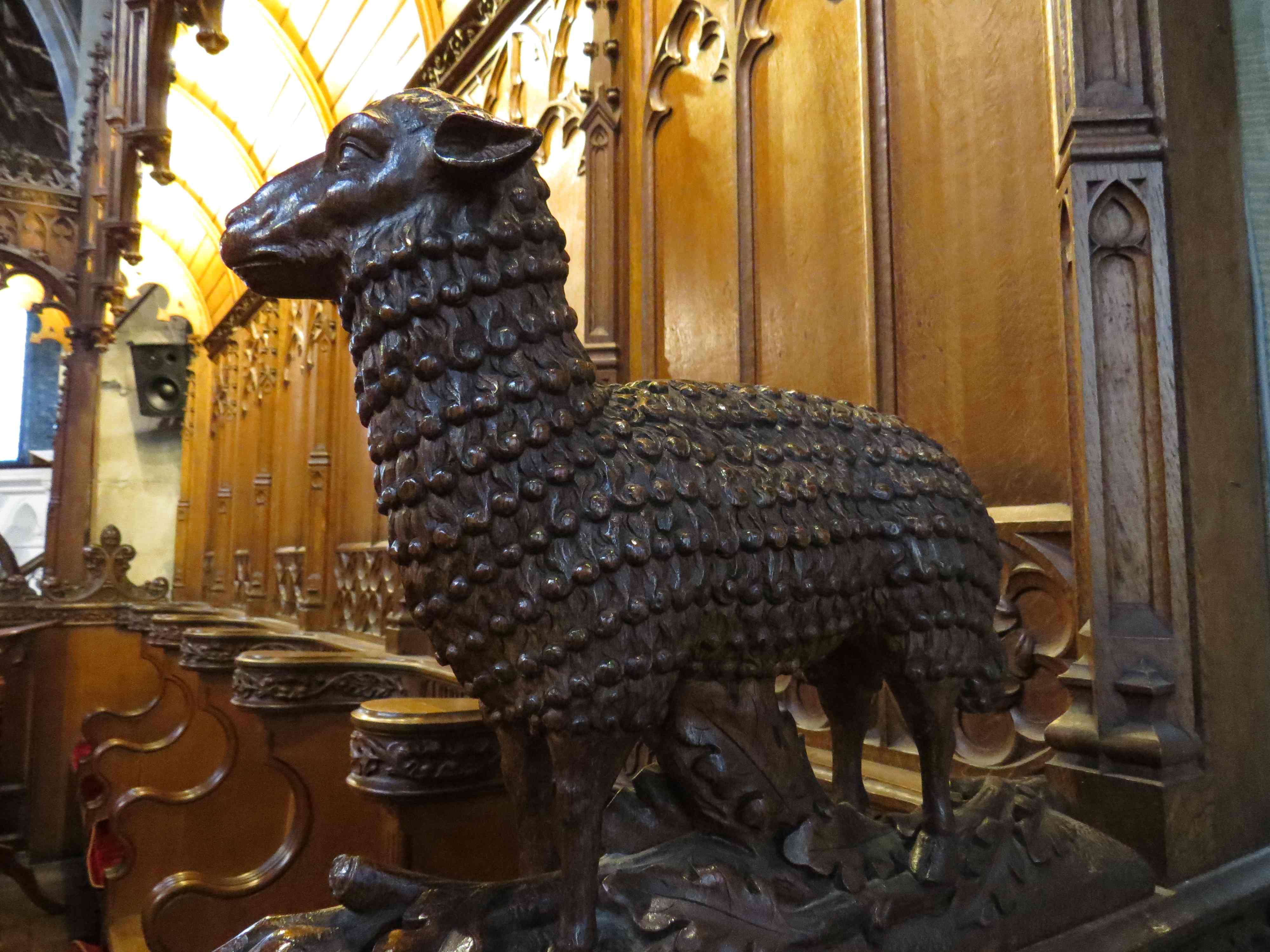 Das Schaf in eigenem Strickpulli ist auch Inventar derselben Kirche.