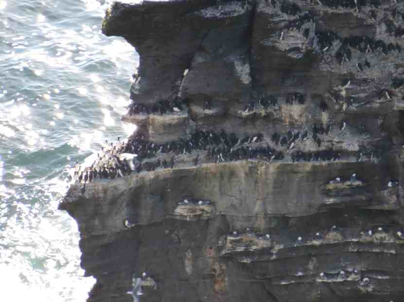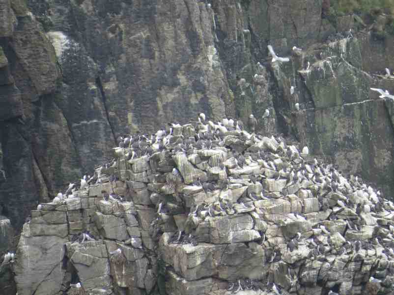 Wie ein Hineinzoomen in das Bild zeigt, ist die felsige Küste, besonders der solitäre Felsen, ein beliebter Brutplatz.