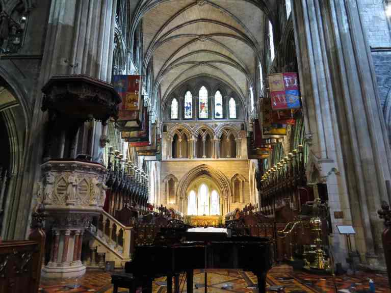 Hinter dem Flügel liegen Notenbücher auf dem Boden, die kurz nach Aufnahme dieses Fotos ein Chor gebraucht hat. Es war sehr schön, dem Chor in dieser großen Kathedrale, die größte Irlands, zuzuhören. Es gibt wohl häufiger Choraufführung in der St. Patrick’s Cathedral und jeder, der dann gerade da ist, kann zuhören (wobei es Eintritt kostet, überhaupt in die Kathedrale zu gehen).