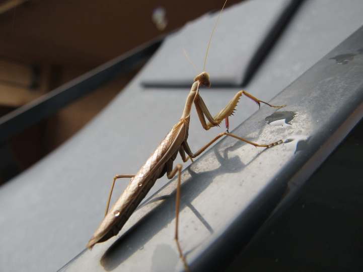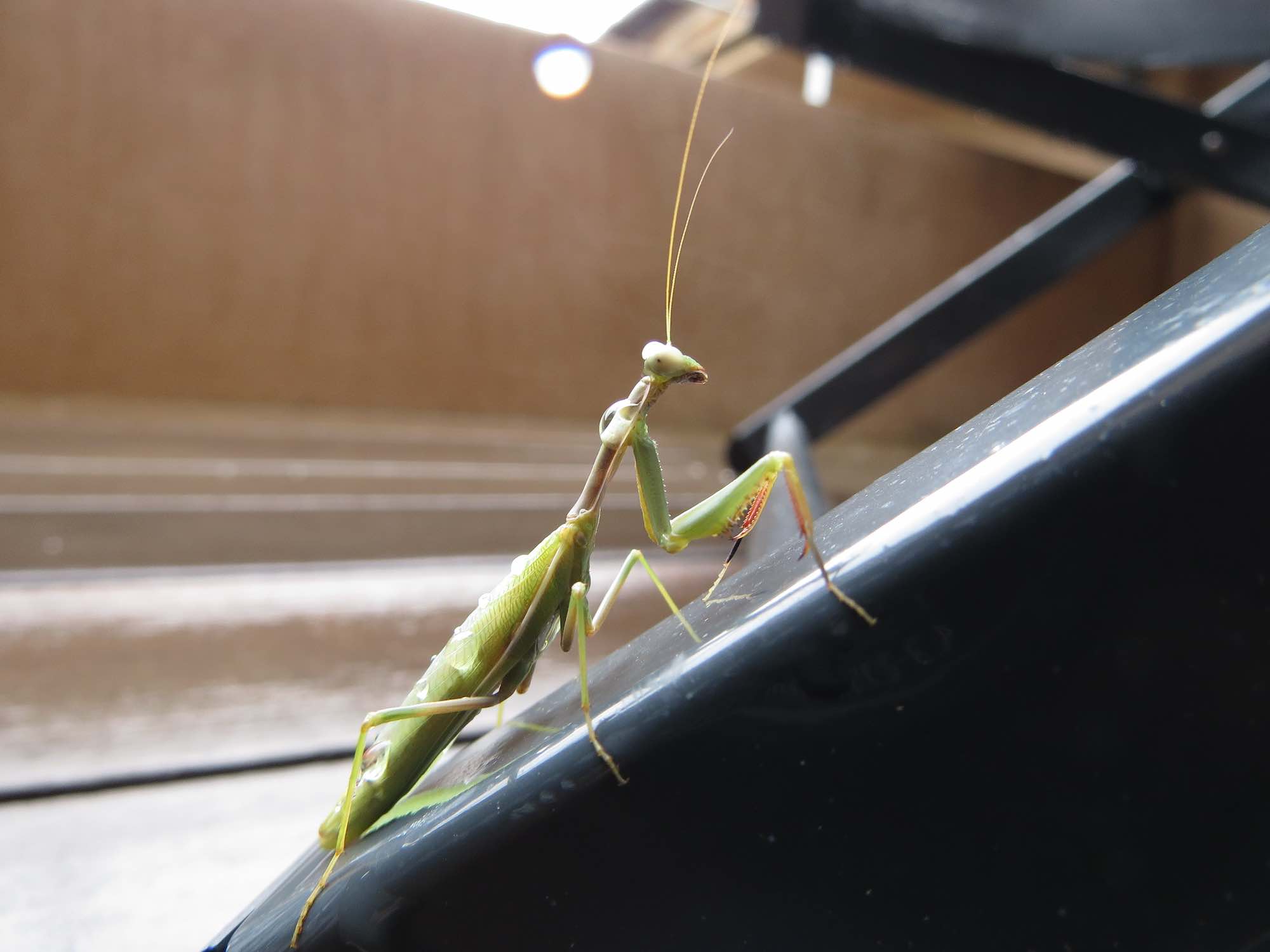 Man erkennt es schon auf dem Foto, Regen war im Anmarsch. Wir haben aber erstmal gefrühstückt und danach habe ich mich um meinen Besuch auf dem Balkon gekümmert: Zwei Gottesanbeterinnen, die zum Modellsitzen vorbeigekommen waren: