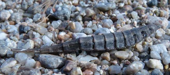 Es war vielleicht 5-10 cm lang, bewegte sich wie ein Wurm vorwärts, hatte aber feste Schuppen, die auf dem Foto gut zu sehen sind. Es strebte zum Wasser, und als es dann am Wasser angekommen war und die erste Miniwelle es erfasst hatte, konnte es sich im Wasser aber nicht bewegen und schien dort auch nicht hinzugehören.