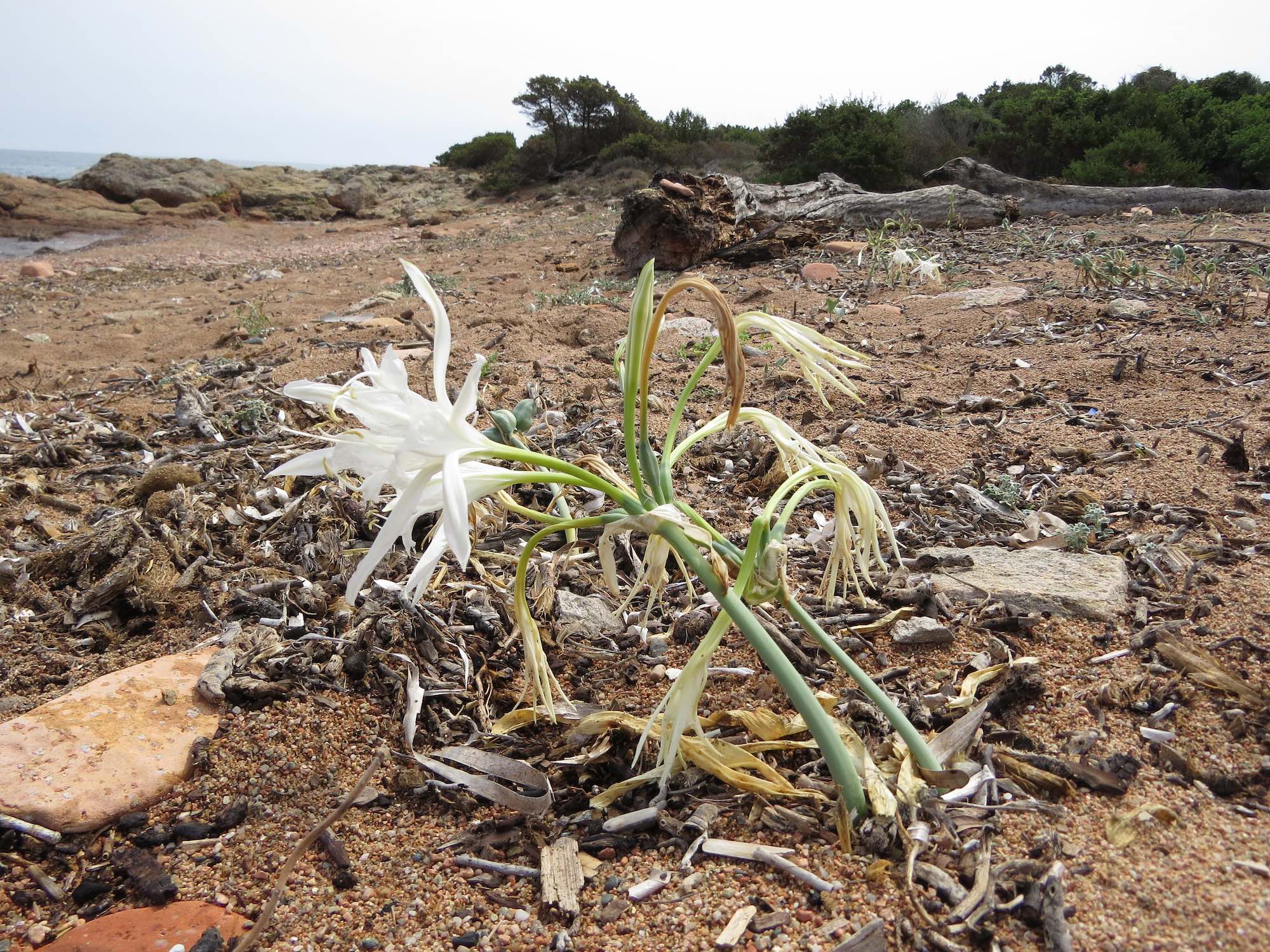 Der Strand war zwar einsam, aber etwas vermüllt (das lag wohl am letzten Sturm und war am nächsten Tag nicht mehr so) und beim Einstieg musste man auch ein wenig auf Steine aufpassen.Typisch und etwas wild schienen auch diese Pflanzen zu sein, die ich mal Strandlilie nennen will, und die an diesem Strand im hinteren Bereich dominant war.