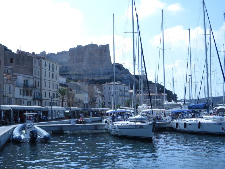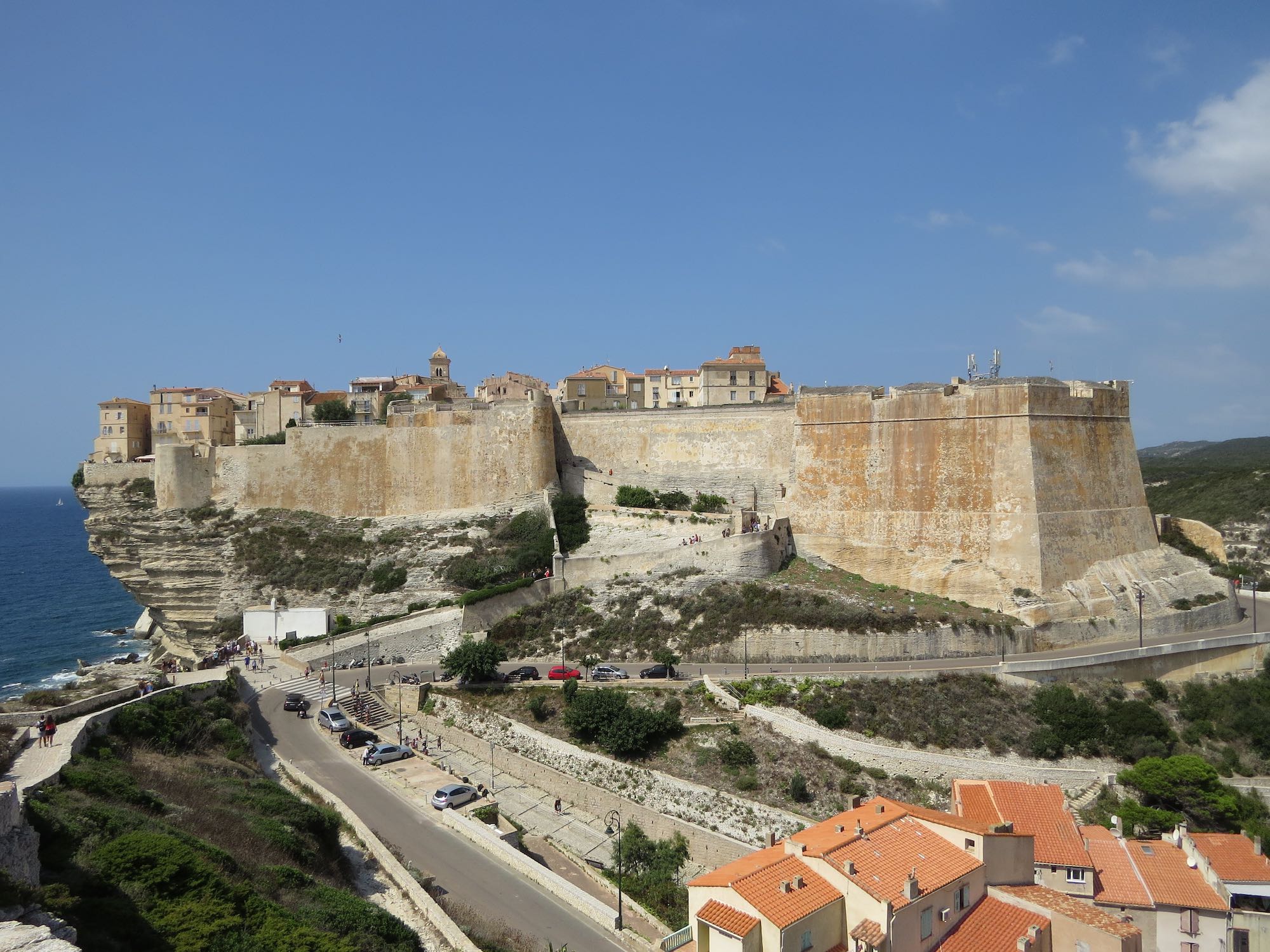 Bonifacio hat eine Oberstadt, die das historische Zentrum bildet und oben auf dem Kalk-Sandstein-Felsen gebaut ist, und eine Unterstadt, also der neuere Rest, einschließlich die Marina. Meist parkt man unten und erhält einen Blick auf den Hafen mit dem Fels mit Oberstadt im Hintergrund.