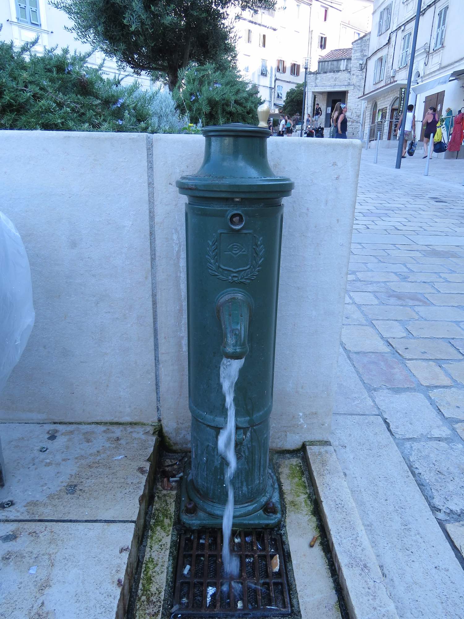 Oben auf der Pumpe ist eine runde Scheibe mit Drehknopf aus Messing (im Foto oben rechts). Mit dem Drehknopf dreht man die runde Scheibe und dann fließt das Wasser, das viele Besucher der Stadt zur Erfrischung nutzen.