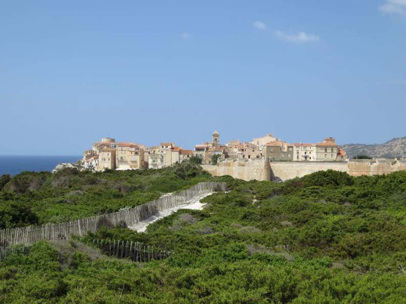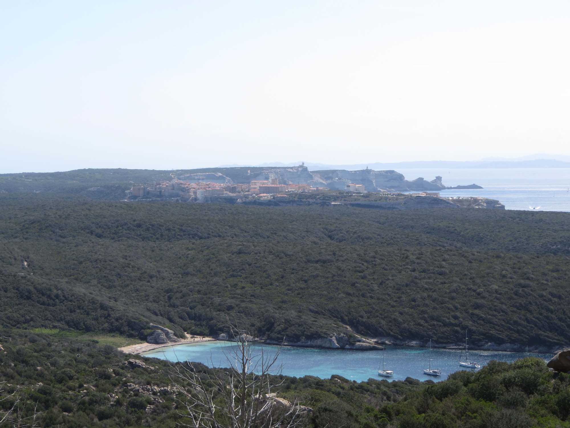 Und so war die Wanderung dann auch im Wesentlichen eine Aussichtstour, mit Aussicht auf Bonifacio und seinen Kalk-/Sandsteinfelsen. Die Wanderung geht im Wesentlichen an der Küste entlang, zwischen grünem Dornengestrüpp und anderen Büschen, mit immer neuen Ansichten der Altstadt: