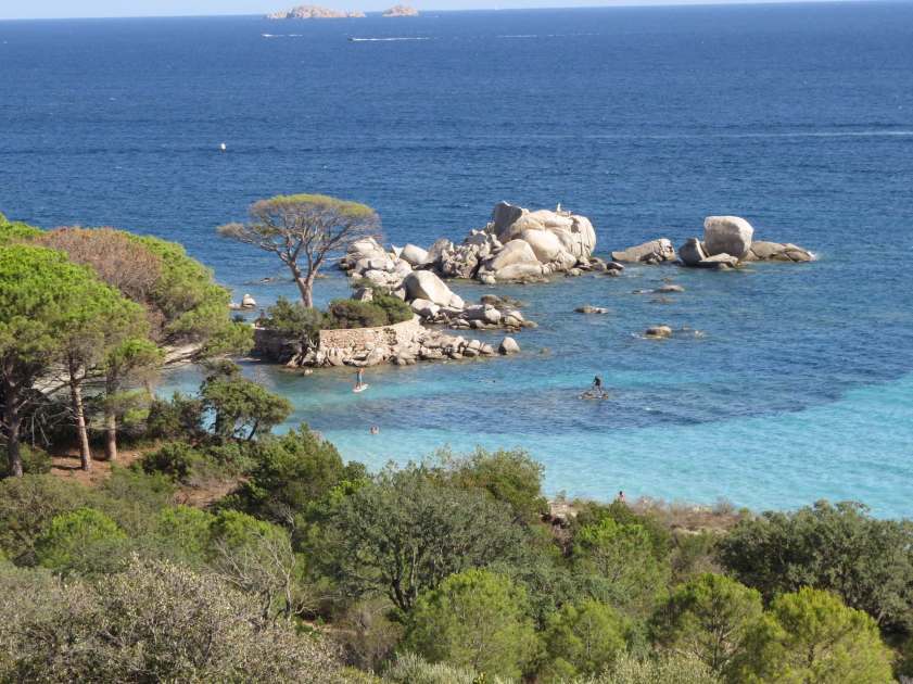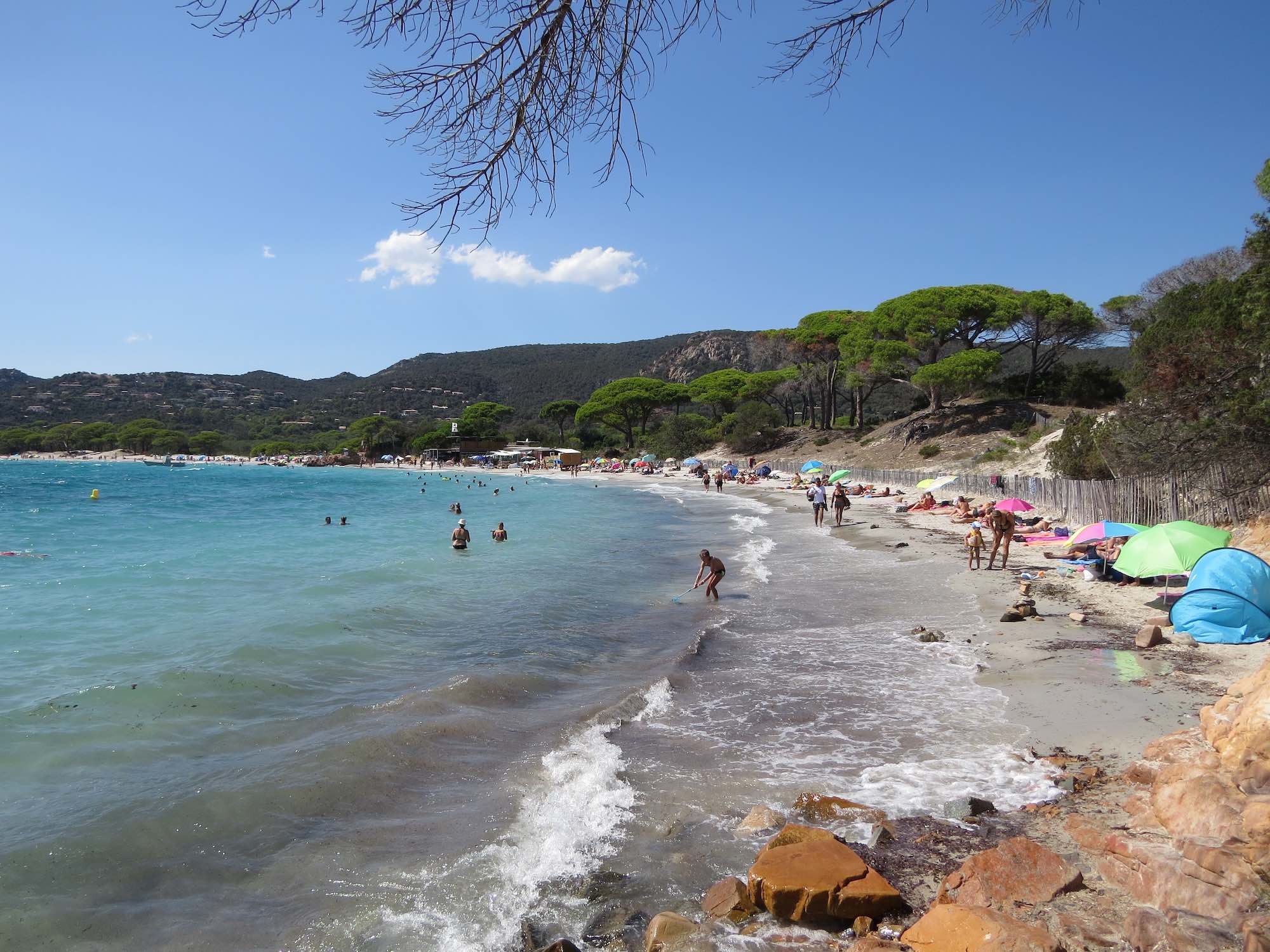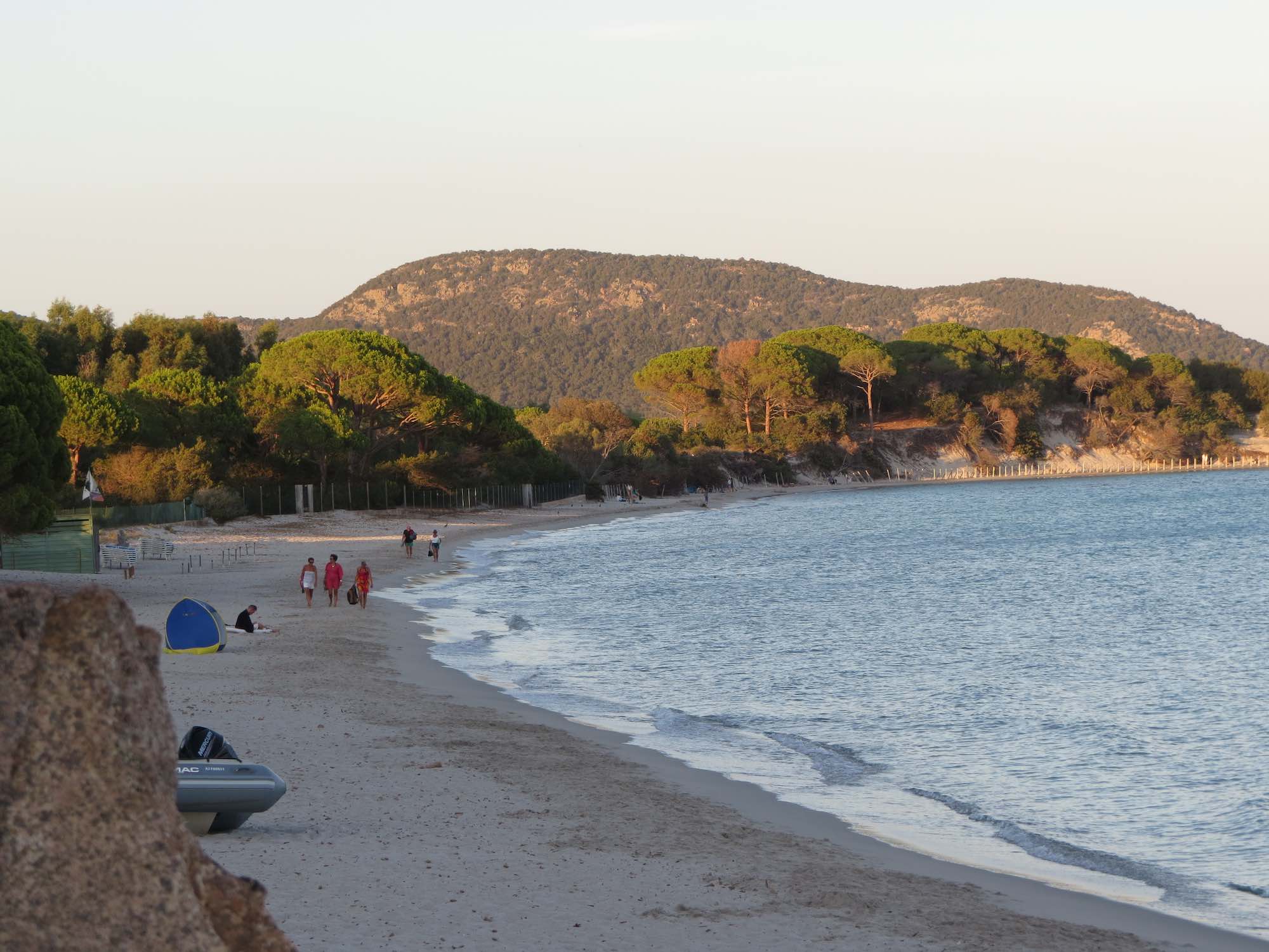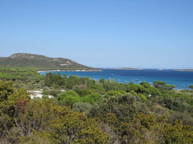 So sieht er also aus, der Palombaggia, mit hübschem Piniensaum im Hintergrund. Der Sand ist schön feinsandig, und es geht sehr flach ins Wasser. Der eigentliche Strand, also der Sandstreifen, ist ziemlich schmal und man ist nicht alleine. Vieles vom direkten Hinterland ist mit mehr oder weniger exklusiven Grundstücken zugepflastert, aber es ist wohl kontrolliert gebaut worden. Jedenfalls wurde so gebaut, dass der Pinienwald erhalten geblieben ist und auch weiterhin das Landschaftsbild prägt, wie das folgende Foto zeigt.