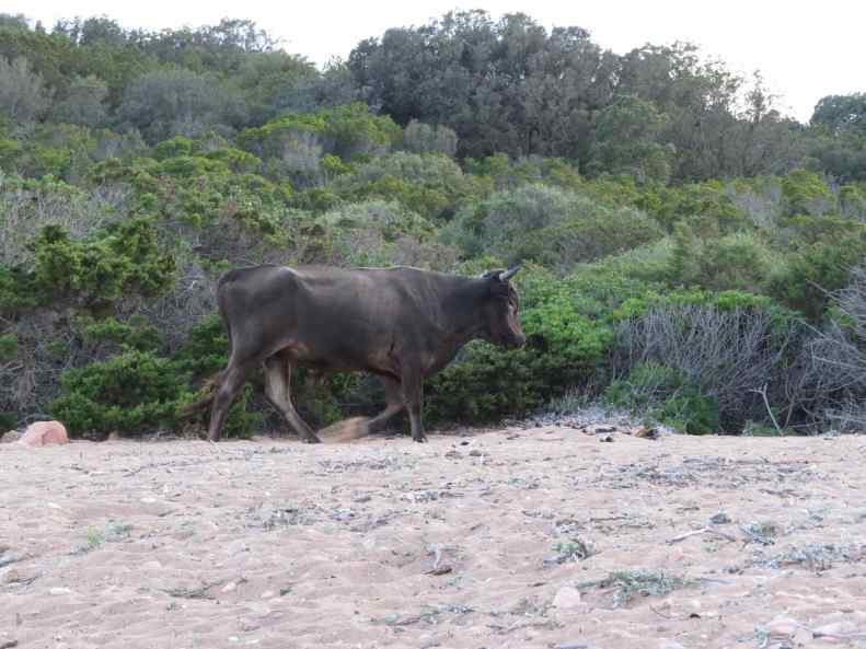 Die Wanderung, mit An- und Abreise, war im Grunde tagfüllend. Dennoch war heute der Tag der Kühe. Eine Kuh, es ist wohl ein Bulle, nutzt einen Teil unseres Strandzugangs selbst auch als Wanderweg. Das konnte man schon diversen Spuren entnehmen. Heute morgen zeigte sie/er sich aber persönlich direkt neben dem Abgang vom Parkplatz…