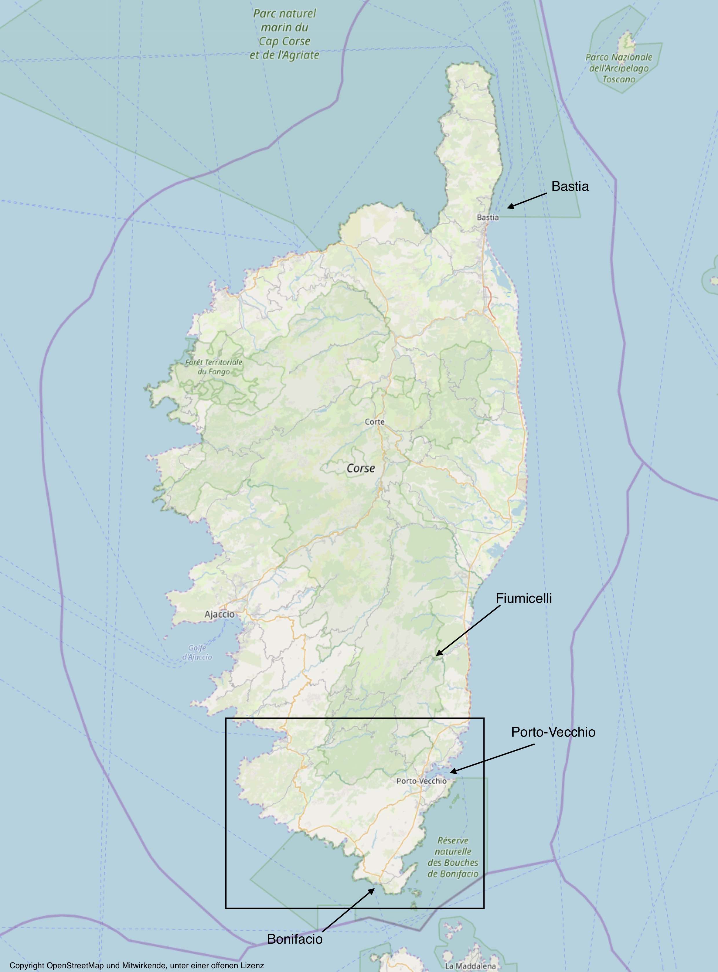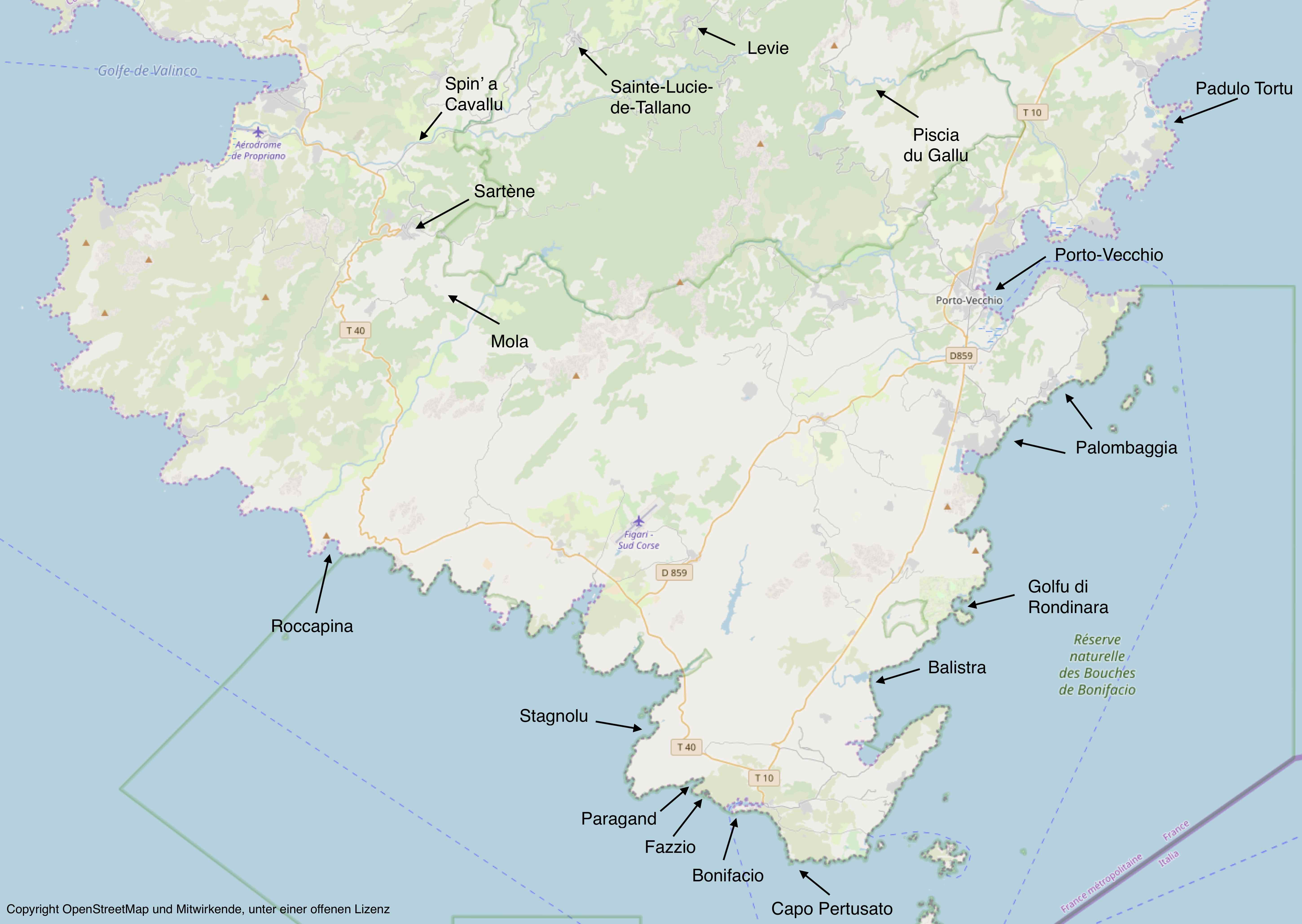 Ansonsten waren wir nur im Süden Korsikas, und die wesentlichen Stellen sind in folgendem Ausschnitt eingezeichnet. Nur der Fiumicelli, den wir am 13. Tag erkundet haben, liegt etwas nördlich vom Kartenausschnitt.