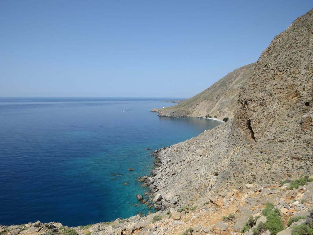 Weiter entlang der Küste kommt zunächst Loutro (s.u.) und dann der Ausgang der Aradena-Schlucht. Jetzt wird auch klar, warum ein Boot hier das geeignete Verkehrsmittel ist. Die westliche Südküste Kretas ist nicht nur sehr gebirgig, sondern auch von vielen Schluchten durchschnitten. Manche Orte haben hier gar keine Straßenanbindung.