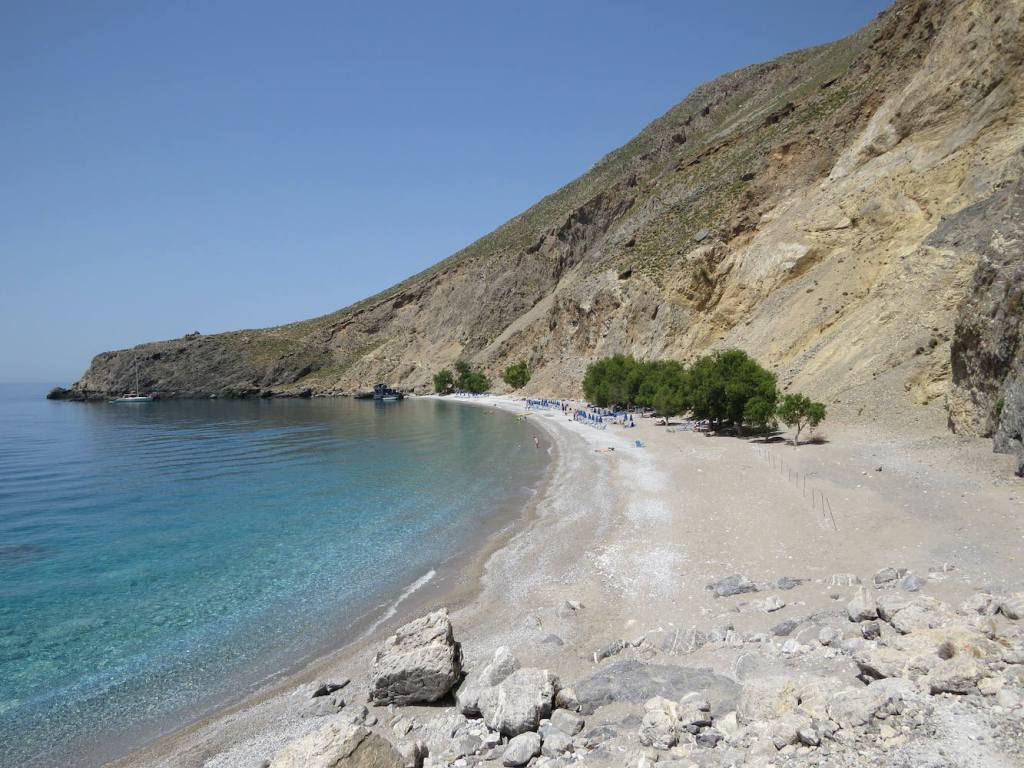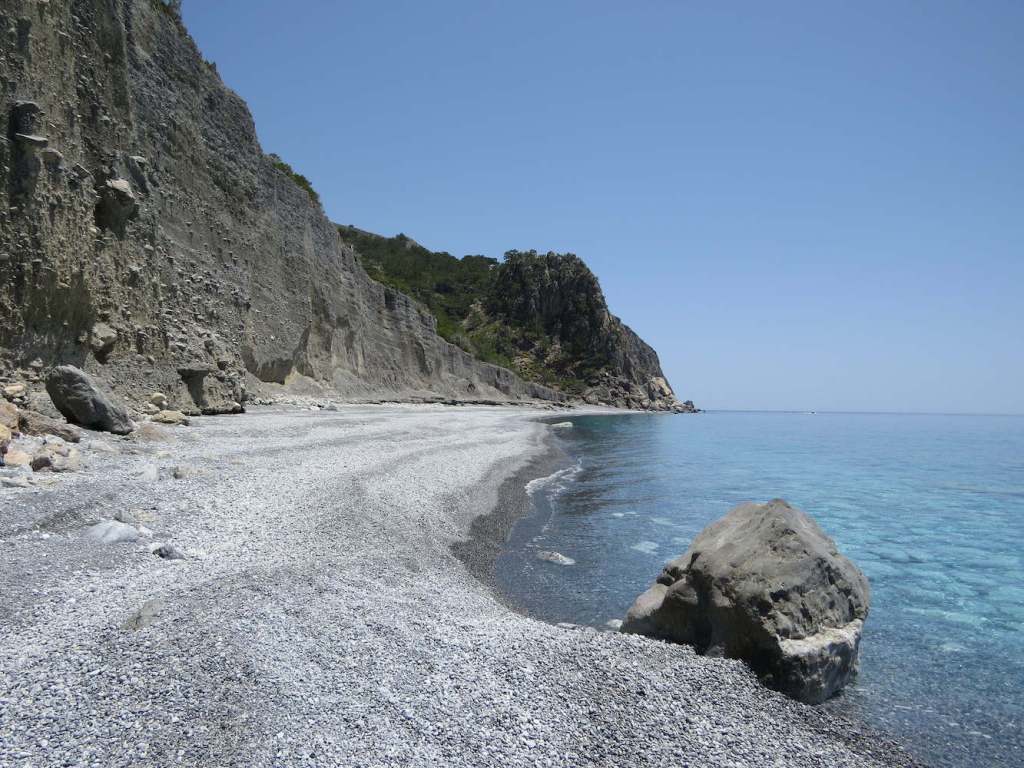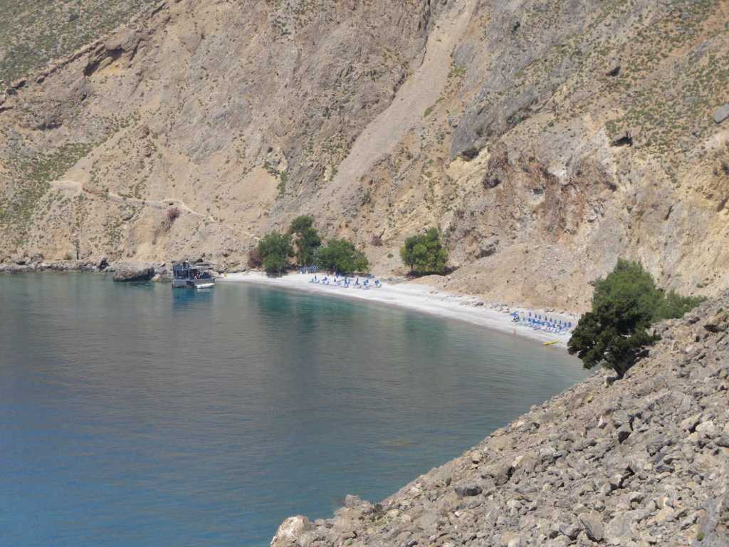 Direkt am Ausgang der Aradena-Schlucht liegt der Marmara Beach, den diese stark herangezoomte Aufnahme zeigt.