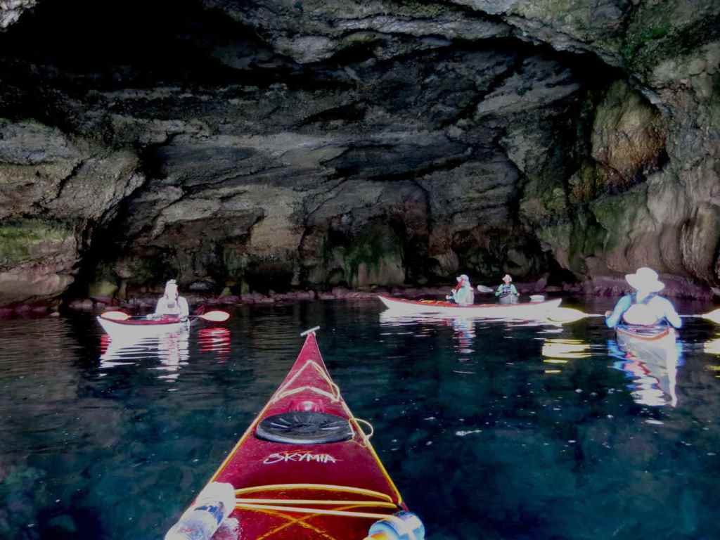 Das Fotos sieht aus, als sei es mit einem Blitzlicht aufgenommen worden, aber es war nur so, dass es in der Höhle sehr dunkel war, jedenfalls im Vergleich zum hellen Sonnenschein draußen, und die Kajaks sehr gut reflektierten. Der Blick nach draußen sah so aus: