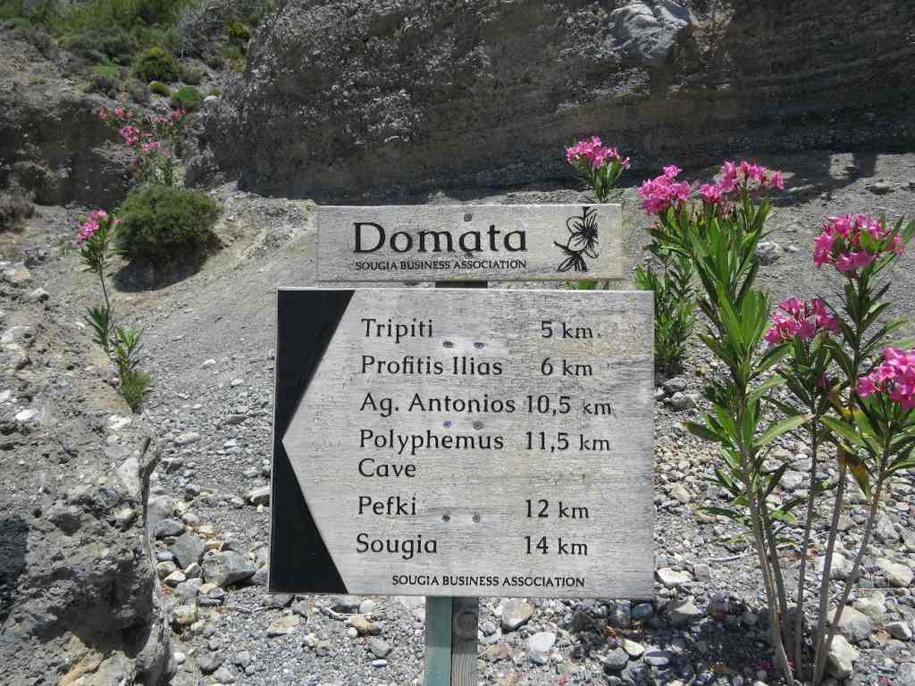 Wie man dem Schild entnehmen kann, liegt Domata auf einer Wanderroute. Trotzdem waren wir hier ganz allein, denn der Strand ist sehr abgelegen und nur durch Wandern ober per Boot erreichbar. Im folgenden Bild ist übrigens unser Mietboot zu sehen.