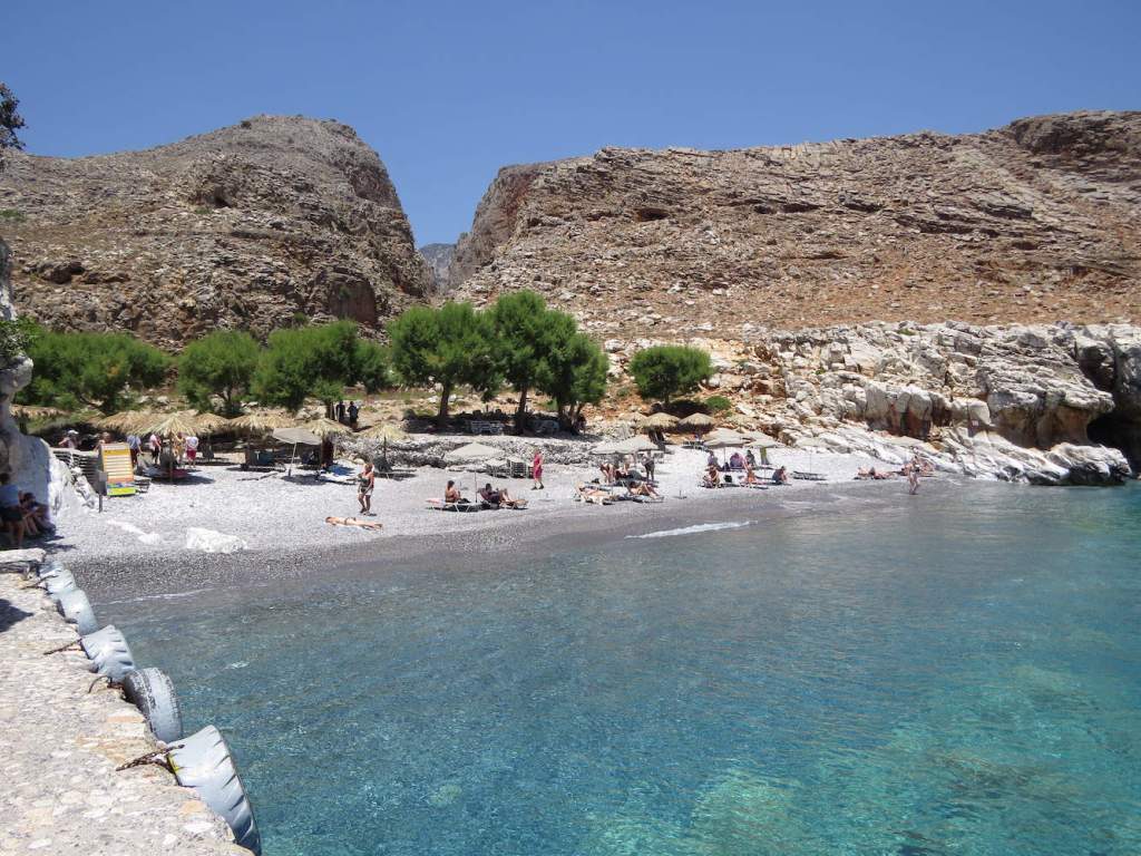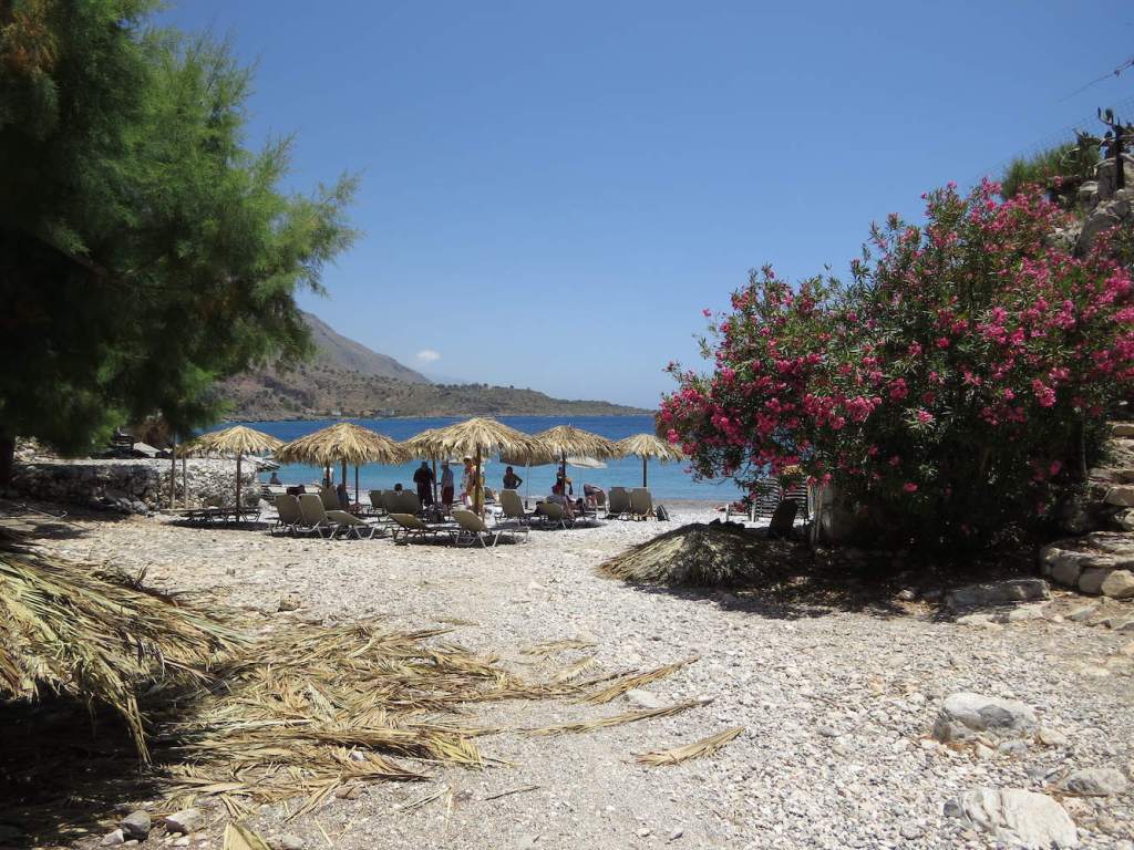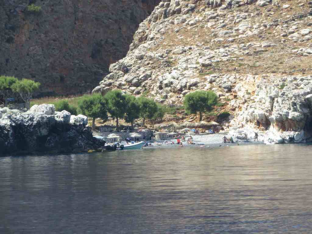 Zum Nachmittag sind wir nach Chora Sfakion zurückgekehrt und von dort mit dem Wassertaxi zum Sweat Water Beach, vorbei an einer von Fels umschlossenen Bucht in der Nähe des Ilingas Beaches.