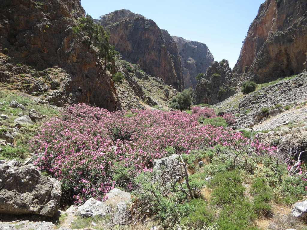 Es gab dann auch bald mehr Vegetation wie hier ein Blütenmeer aus Oleander, der in Griechenland recht häufig ist.