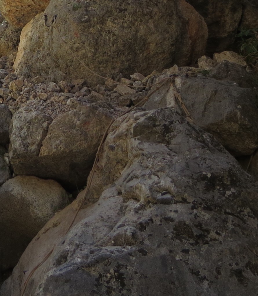 Jetzt kann man erkennen, wie unser Weg war. Zunächst gab es dieses Führungsseil, damit man nicht abstürzt, und dann musste man sich an dem Doppelseil mit den Knoten abseilen, denn der blanke Felsen gab gar keinen Halt. Die Knoten waren vielleicht im Abstand von einem halben Meter oder mehr und an dem Seil musste man sich geschätzt 5 Meter abseilen. Und dann ging es mit rostigen Leitern weiter.