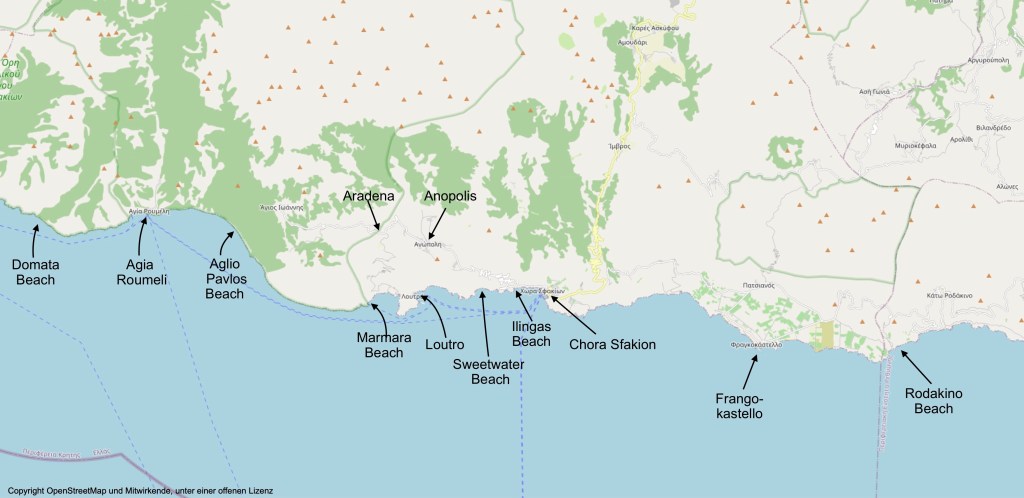 Besonders dieser westliche Bereich der Südküste, man könnte sagen, alles, was westlich von Chora Sfakion liegt, ist so zerklüftet, dass es keine durchgängige Küstenstraße gibt. Manche Orte, wie eben auch der am Ausgang der Samaria-Schucht (Agia Roumeli), können gar nicht mit dem Auto erreicht werden. Sie sind dann nur zu Fuß oder per Boot erreichbar.